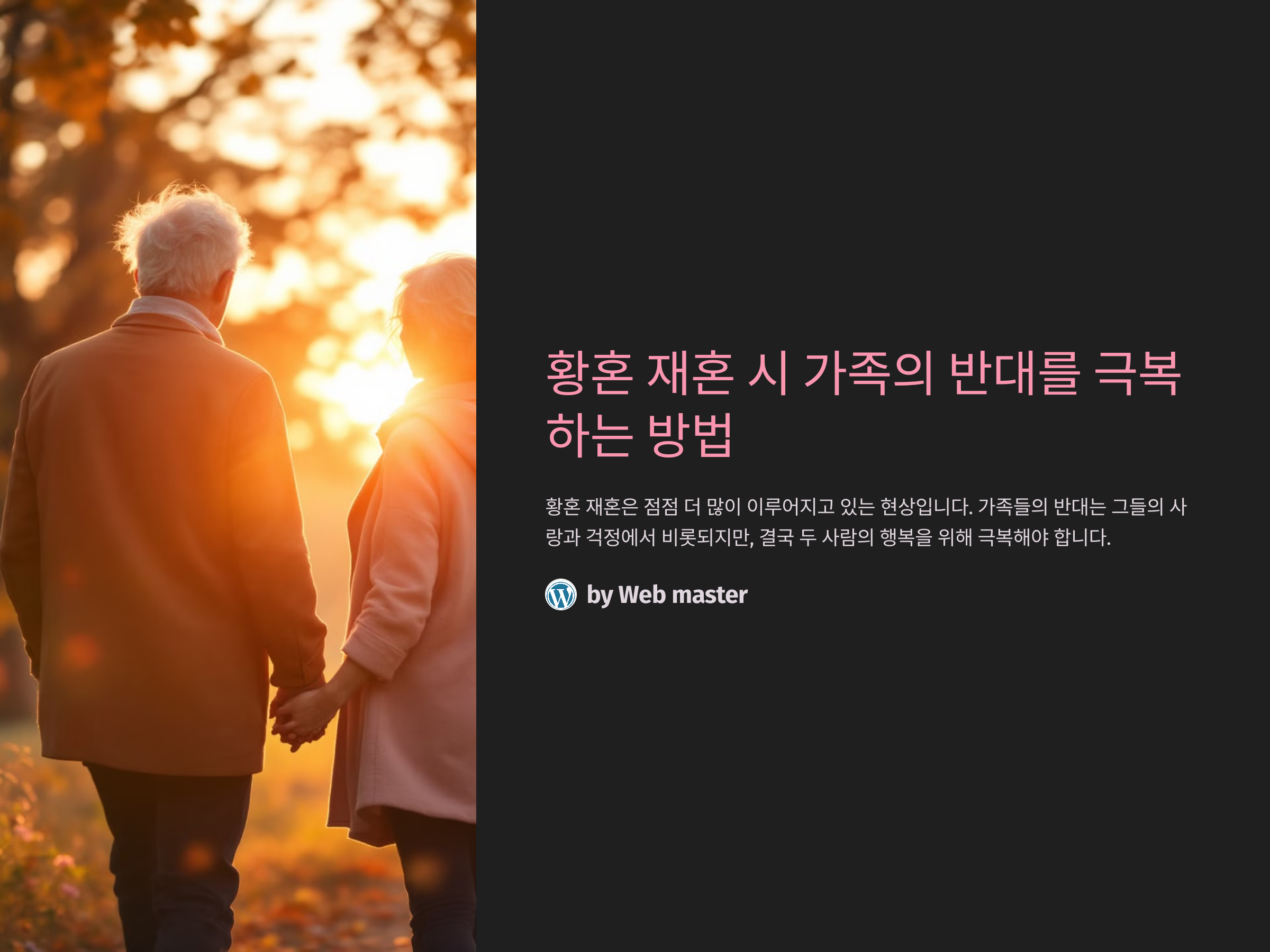 황혼 재혼 시 가족의 반대를 극복하는 과정은 간단하지 않을 수 있습니다. 그러나, 그 과정에서 중요한 것은 서로의 마음을 이해하고 존중하는 것입니다. 충분한 대화와 배려, 상대방의 장점 강조, 그리고 시간과 인내가 필요합니다. 때로는 전문가의 도움을 받거나, 점차적인 관계 개선을 통해 갈등을 해결할 수 있습니다. 황혼 재혼을 고려하는 모든 분들에게, 이 과정이 부디 긍정적이고 행복한 결실을 맺을 수 있기를 바랍니다.