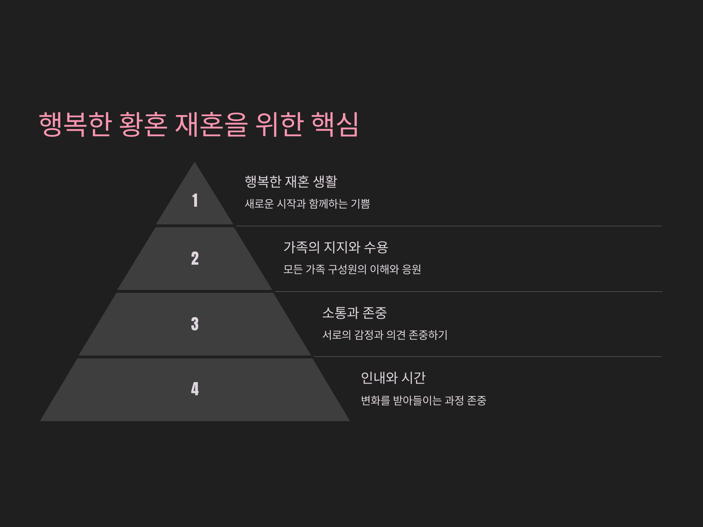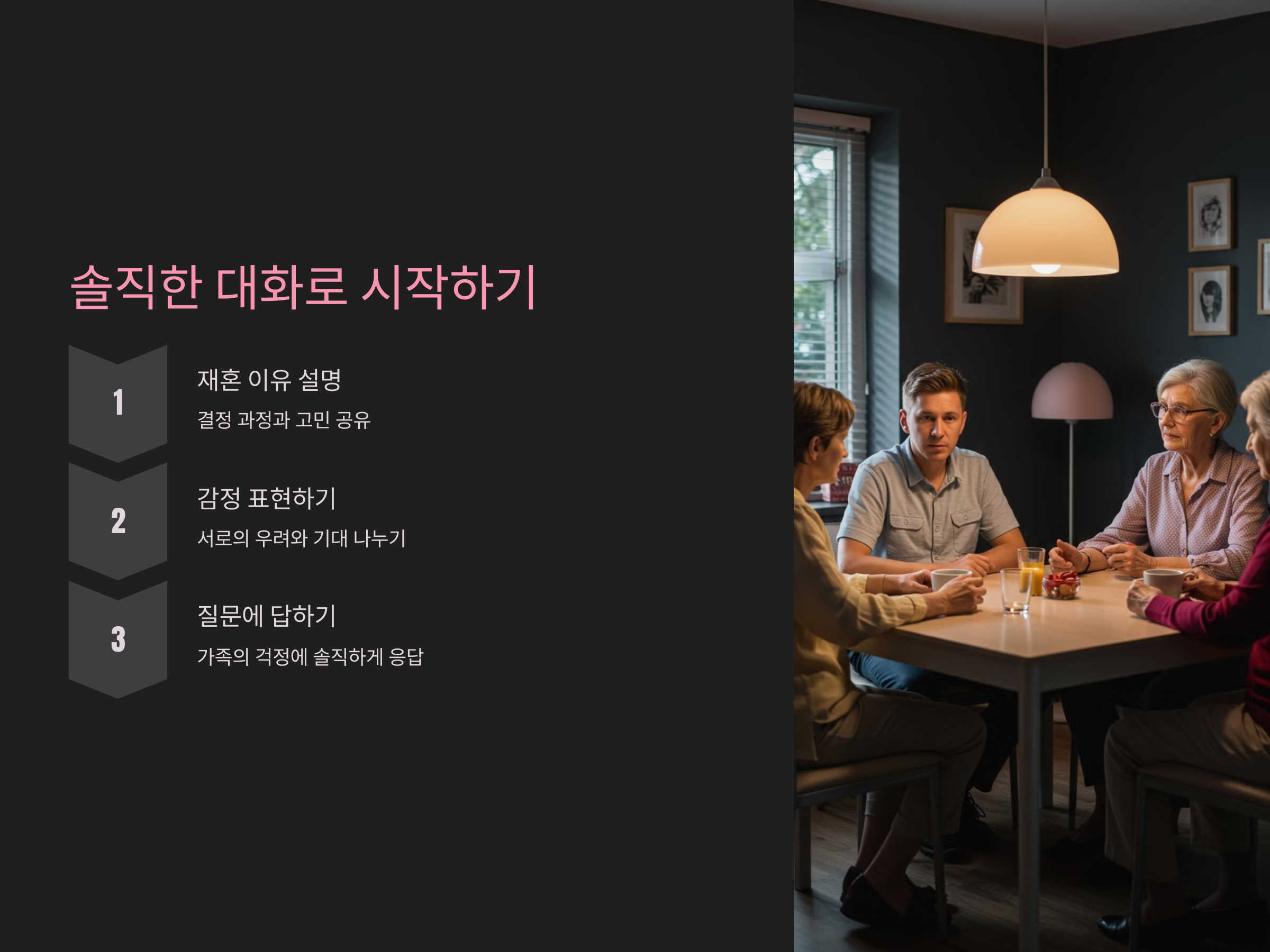대화에서는 감정을 솔직하게 표현하는 것이 중요합니다. 가족들이 무엇을 걱정하는지, 왜 재혼에 반대하는지, 그들의 우려를 듣고 이를 해소할 수 있는 방법을 찾아보는 것입니다. 때로는 '단순한 우려'로 끝날 수 있기 때문에, 서로의 생각을 잘 나누는 것이 핵심입니다.