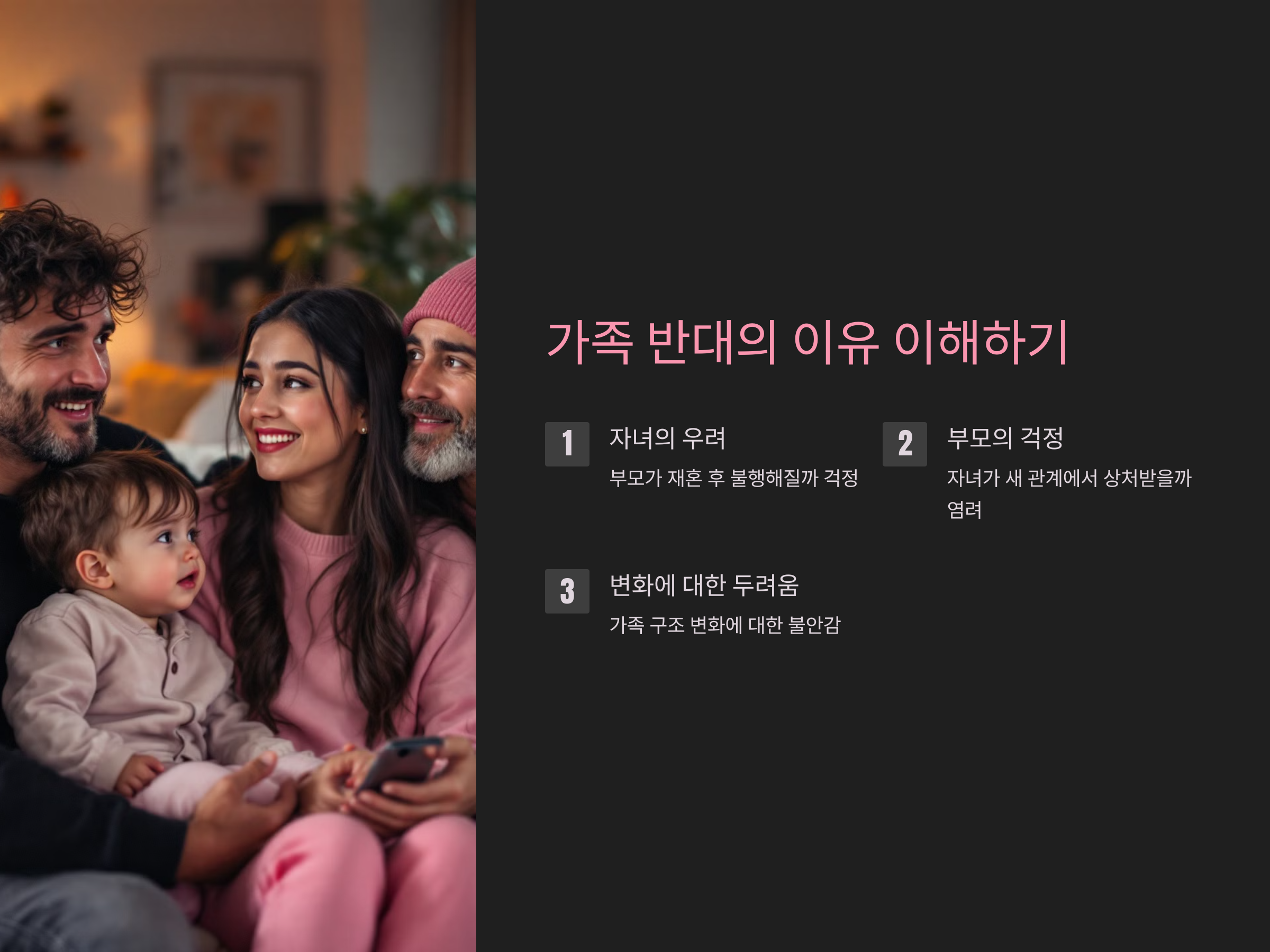 부모님의 반대가 가장 큰 장벽인 경우가 많습니다. 부모님은 자녀가 행복해지기를 원하지만, 재혼으로 인해 자녀가 또 다른 상처를 입을까 봐 걱정할 수 있습니다. 부모님의 마음을 이해하고 그들의 입장에서 생각해 보는 것이 중요합니다.