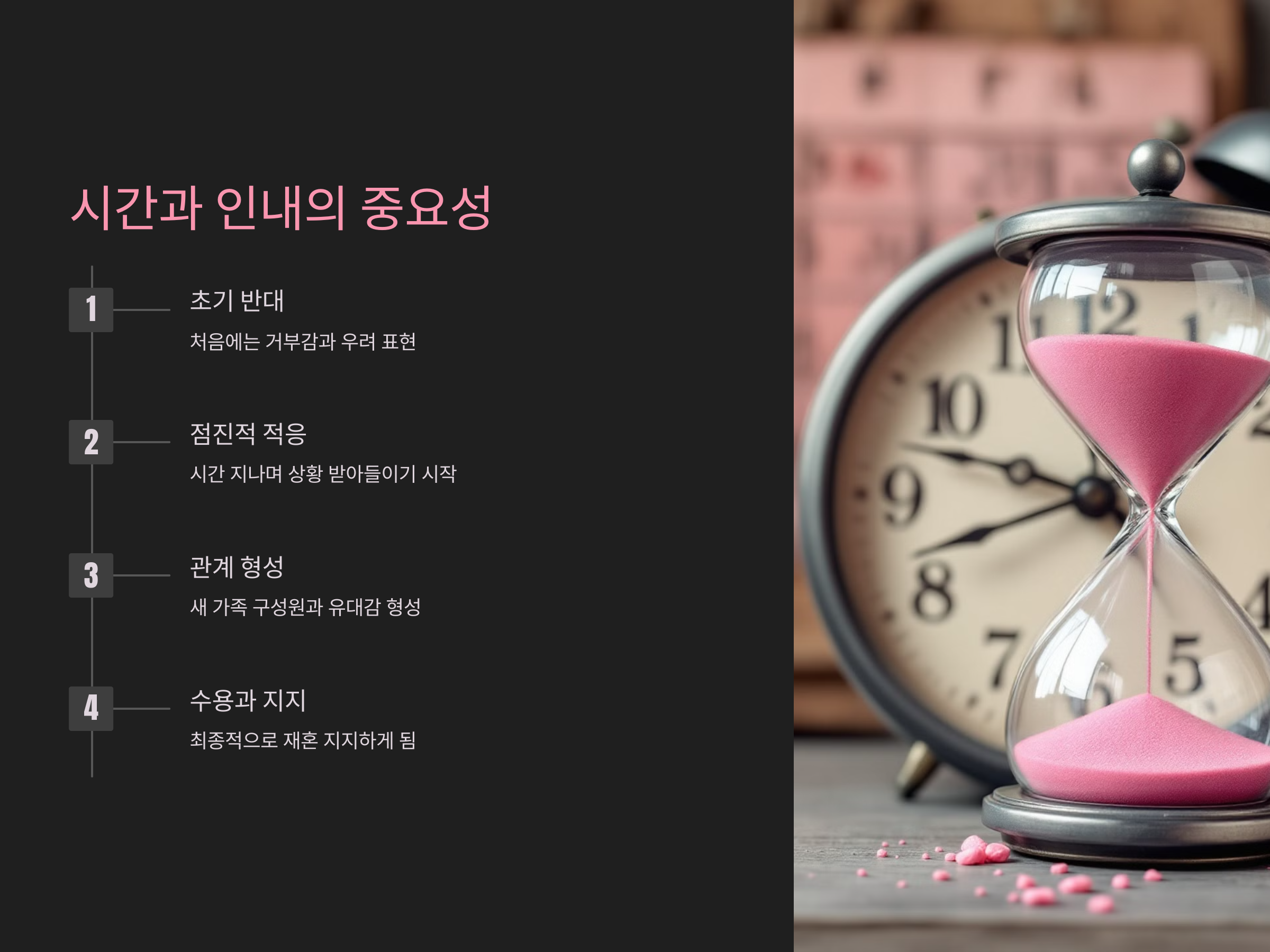 가족들이 반대하는 시점에서 무리하게 설득하려 하기보다는, 차근차근 시간과 인내를 가지고 자신의 결정을 설명하고, 관계가 안정될 수 있도록 하는 것이 중요합니다. 가족들이 점차 재혼 상대를 알게 되면, 불안감이나 걱정이 사라지기도 합니다.