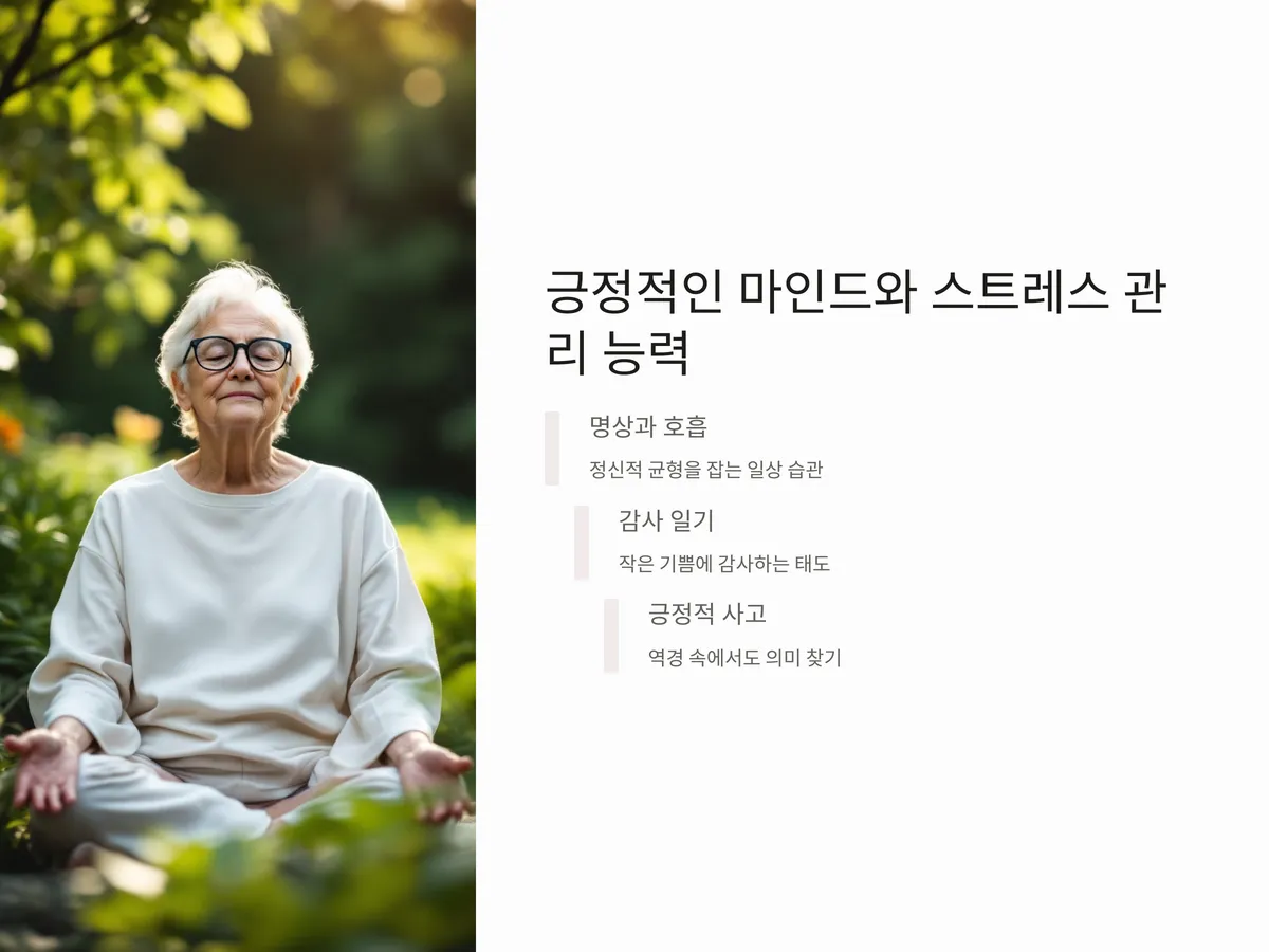 마지막으로 건강한 노후를 보내는 사람들은 대부분 긍정적인 삶의 태도를 유지합니다. 스트레스는 만병의 근원이라는 말처럼, 만성 스트레스는 면역력을 떨어뜨리고 노화를 촉진하는 주요 요인입니다. 이에 따라 명상, 호흡 운동, 감사일기 작성 등 정신적 균형을 잡는 활동을 일상에 도입하는 것이 중요합니다.