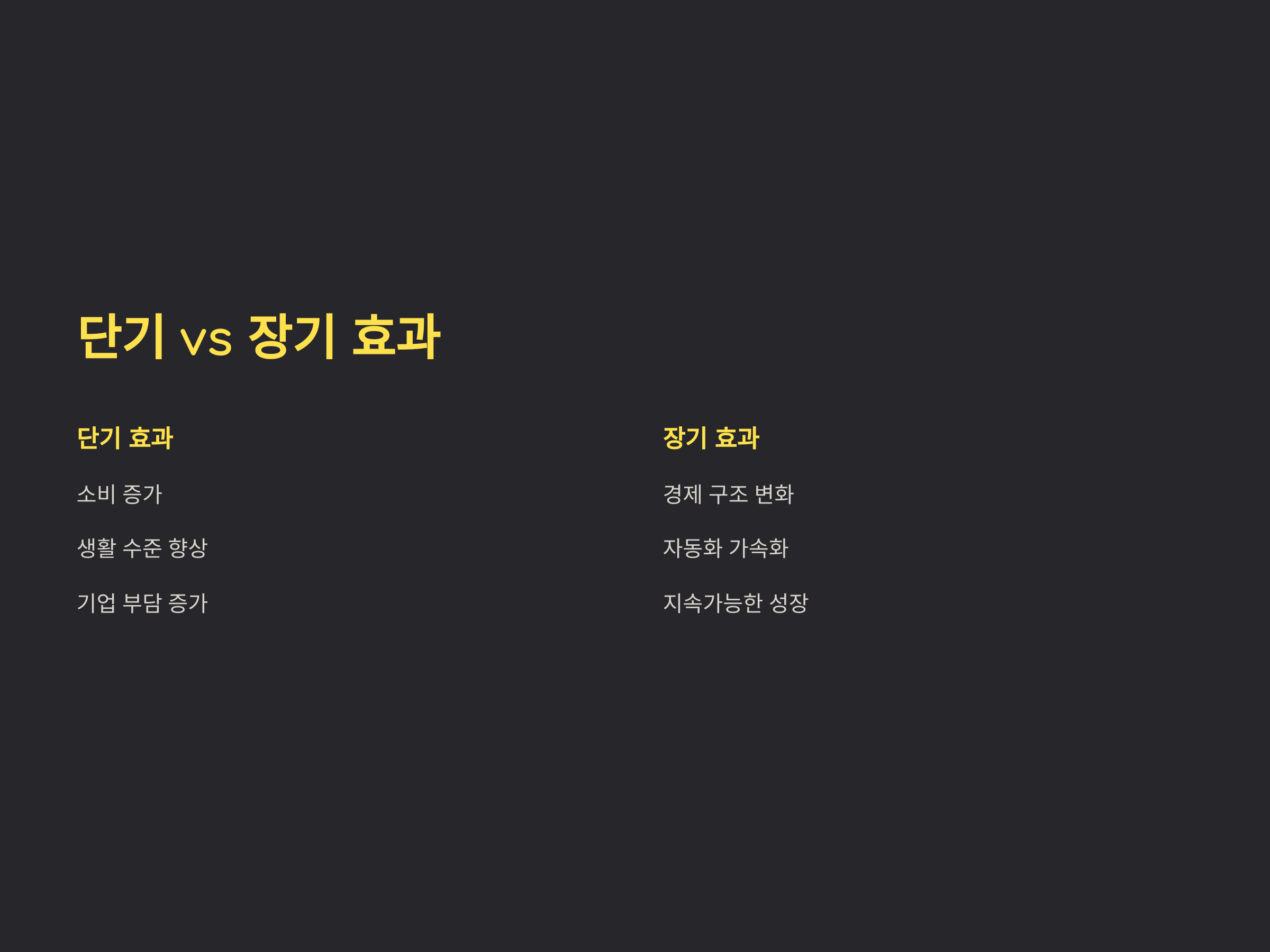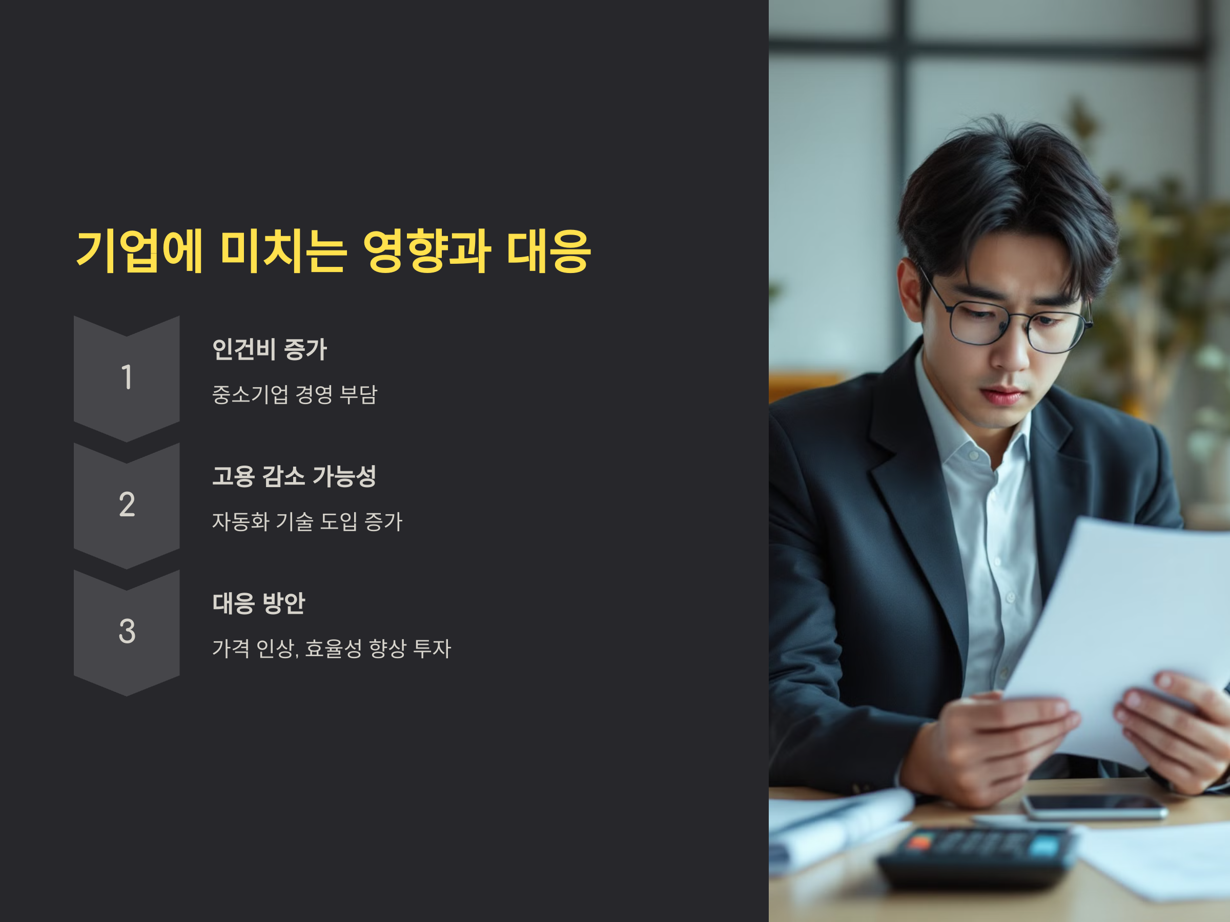 반면, 최저임금 인상이 기업에는 부담을 줄 수 있습니다. 특히 중소기업은 인건비 증가로 인해 경영에 어려움을 겪을 수 있습니다. 일부 기업들은 고용을 줄이거나, 자동화와 같은 대체 기술을 도입할 가능성이 큽니다. 이러한 변화는 노동 시장의 구조적 변화를 초래할 수 있으며, 그로 인해 일자리 불안정성이 증가할 수 있습니다.