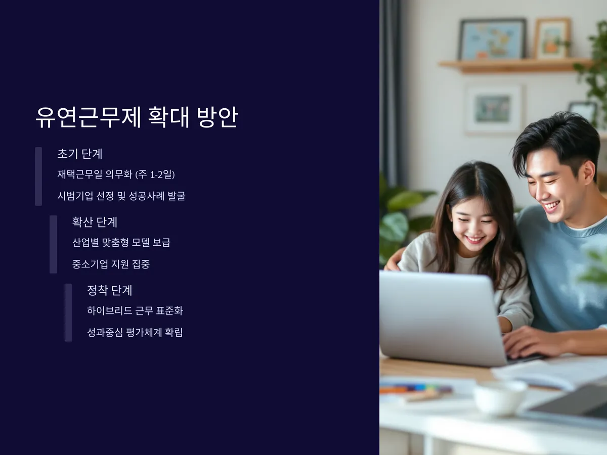 카테고리 없음 # 3. 향후 전망 및 과제 by stext 2025. 4. 17. 반응형 정책적 시사점: 재택근무의 정착을 위해 법적, 제도적 기반 마련 필요 기업의 재택근무 도입을 위한 인프라 및 컨설팅 지원 강화 재택근무와 관련된 노동시장 성과 분석을 통한 정책 개선 추진 방향: 유연근무제 확대 및 관련 법령 반응형 공유하기 게시글 관리 stext