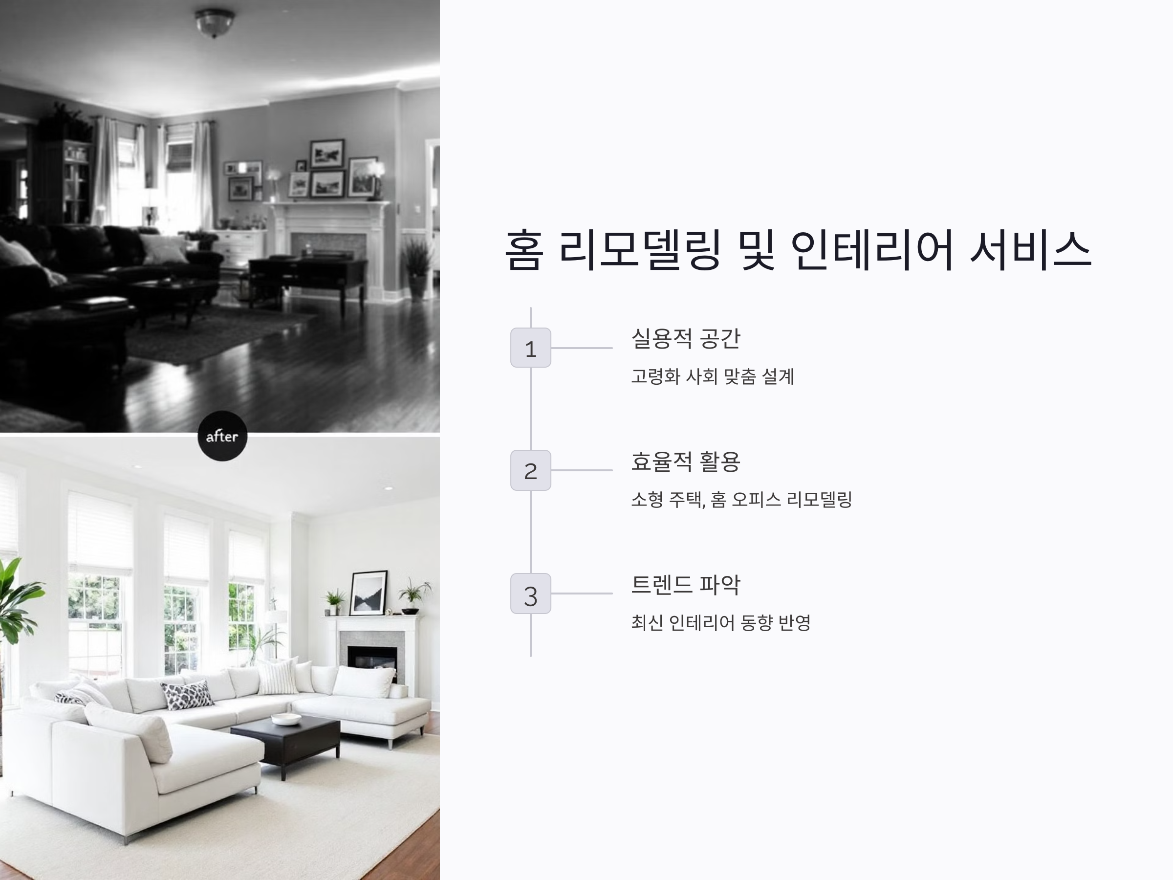 또한, 작은 공간을 효율적으로 활용하려는 사람들의 수요가 증가하면서 홈 오피스나 스튜디오, 소형 주택에 대한 리모델링 서비스가 각광받고 있습니다. 창업자는 디자인 감각과 함께 실용적인 아이디어를 바탕으로 고객들에게 만족스러운 공간을 제공할 수 있습니다.