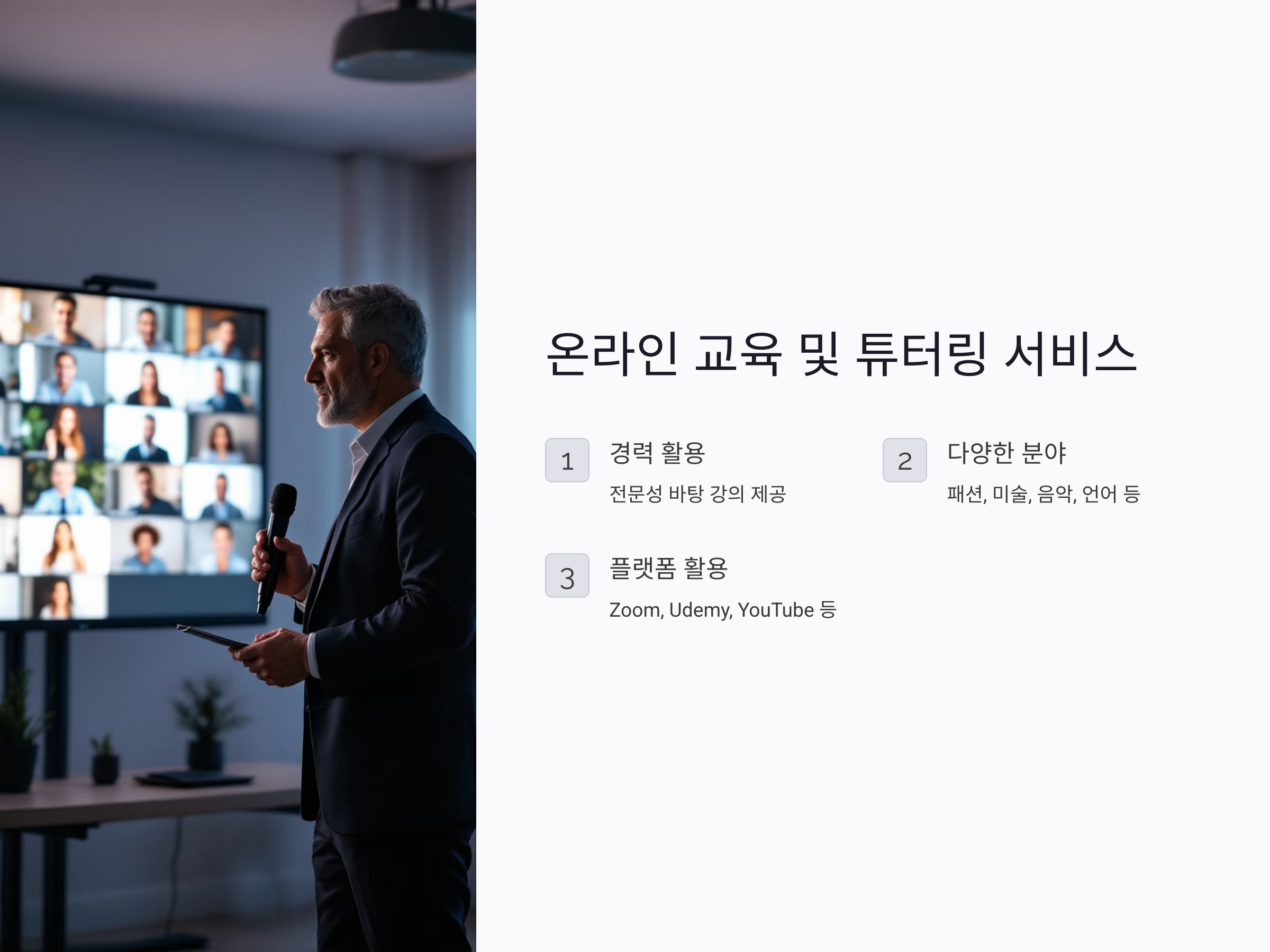 - 팁: 기존에 많이 사용되는 플랫폼인 Zoom, Udemy, YouTube 등에서 쉽게 시작할 수 있습니다.
