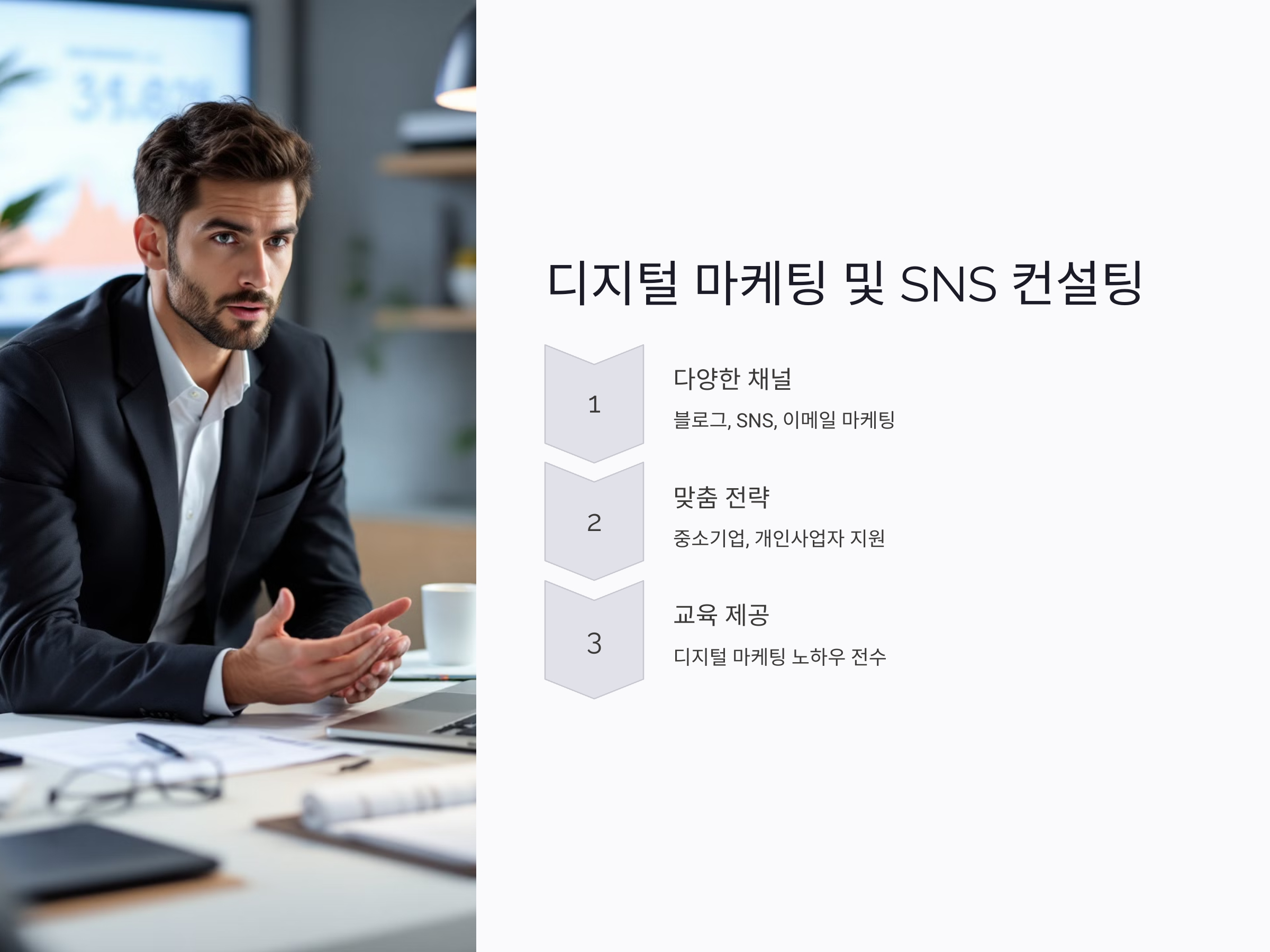 블로그, SNS, 이메일 마케팅 등 다양한 디지털 채널을 활용한 마케팅 전략을 제공하는 서비스는 매우 유망한 창업 아이템입니다. 또한, 중소기업이나 개인사업자에게 필요한 SNS 운영을 지원하거나, 디지털 마케팅 교육을 제공할 수도 있습니다.