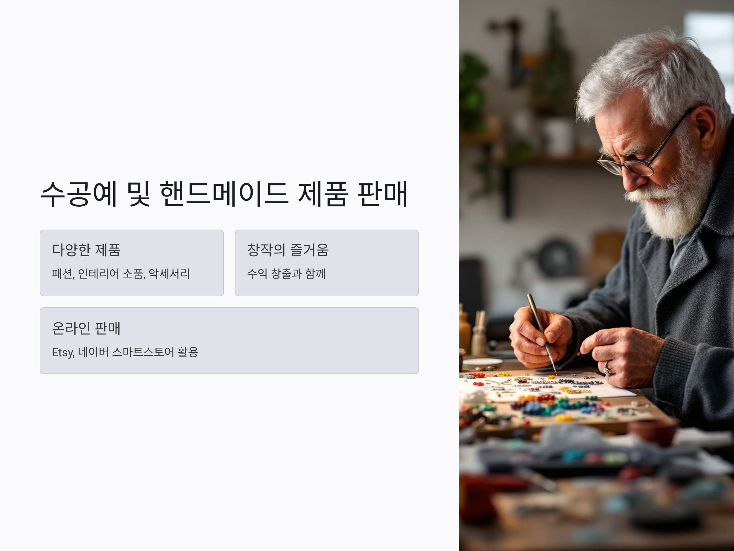 수공예 및 핸드메이드 제품은 항상 인기를 끌고 있습니다. 특히 50대 이상의 사람들은 오랜 세월 동안 쌓아온 손재주나 예술적 감각을 활용할 수 있는 좋은 기회입니다. 패션, 인테리어 소품, 악세서리 등 다양한 수공예 제품을 제작하여 온라인에서 판매할 수 있습니다.