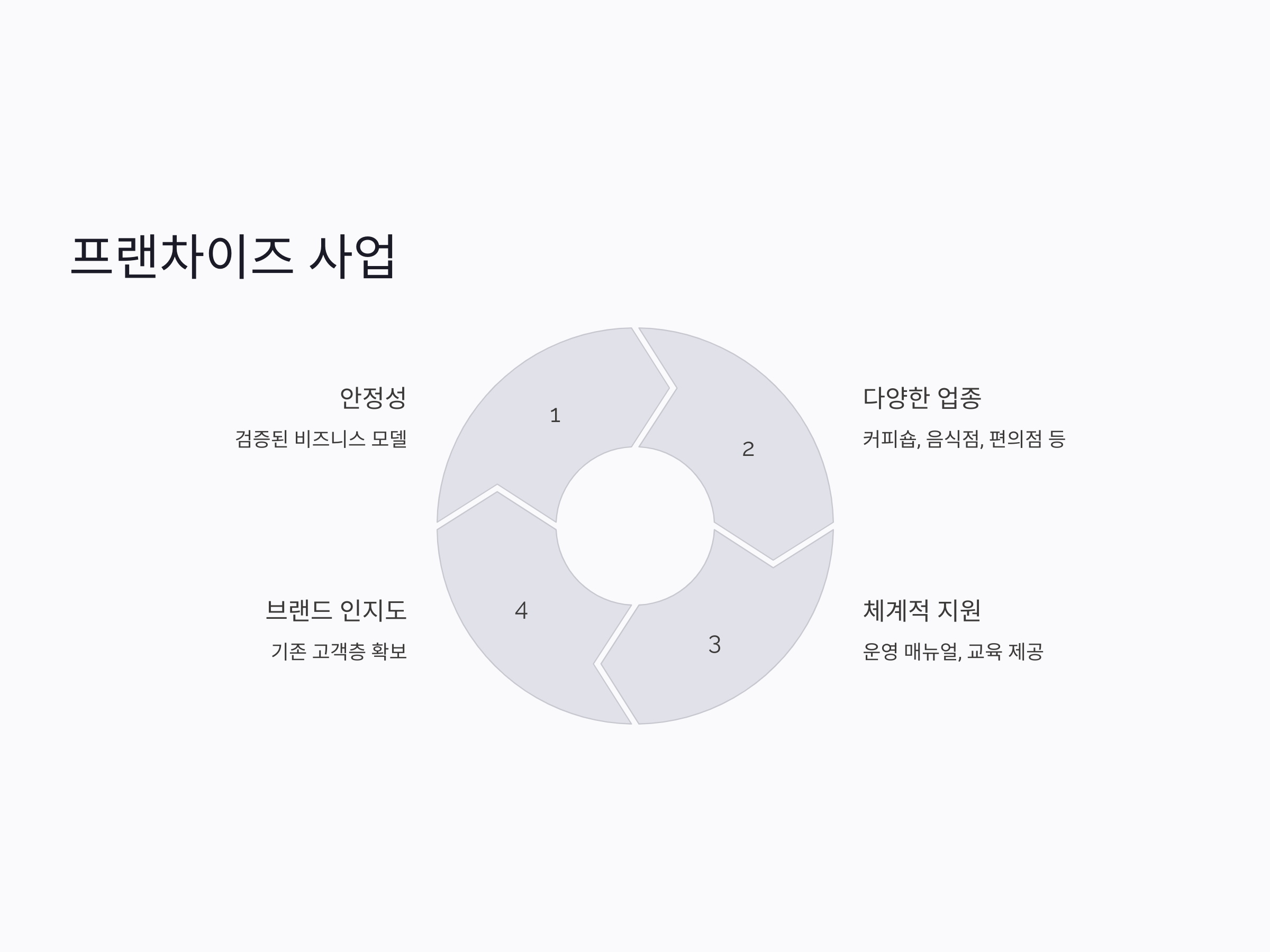 커피숍, 음식점, 편의점, 청소 서비스 등 다양한 업종에서 프랜차이즈가 존재하며, 대부분의 프랜차이즈는 체계적인 운영 매뉴얼과 지원 시스템을 제공하기 때문에 창업 경험이 없는 사람이라도 쉽게 사업을 시작할 수 있습니다.