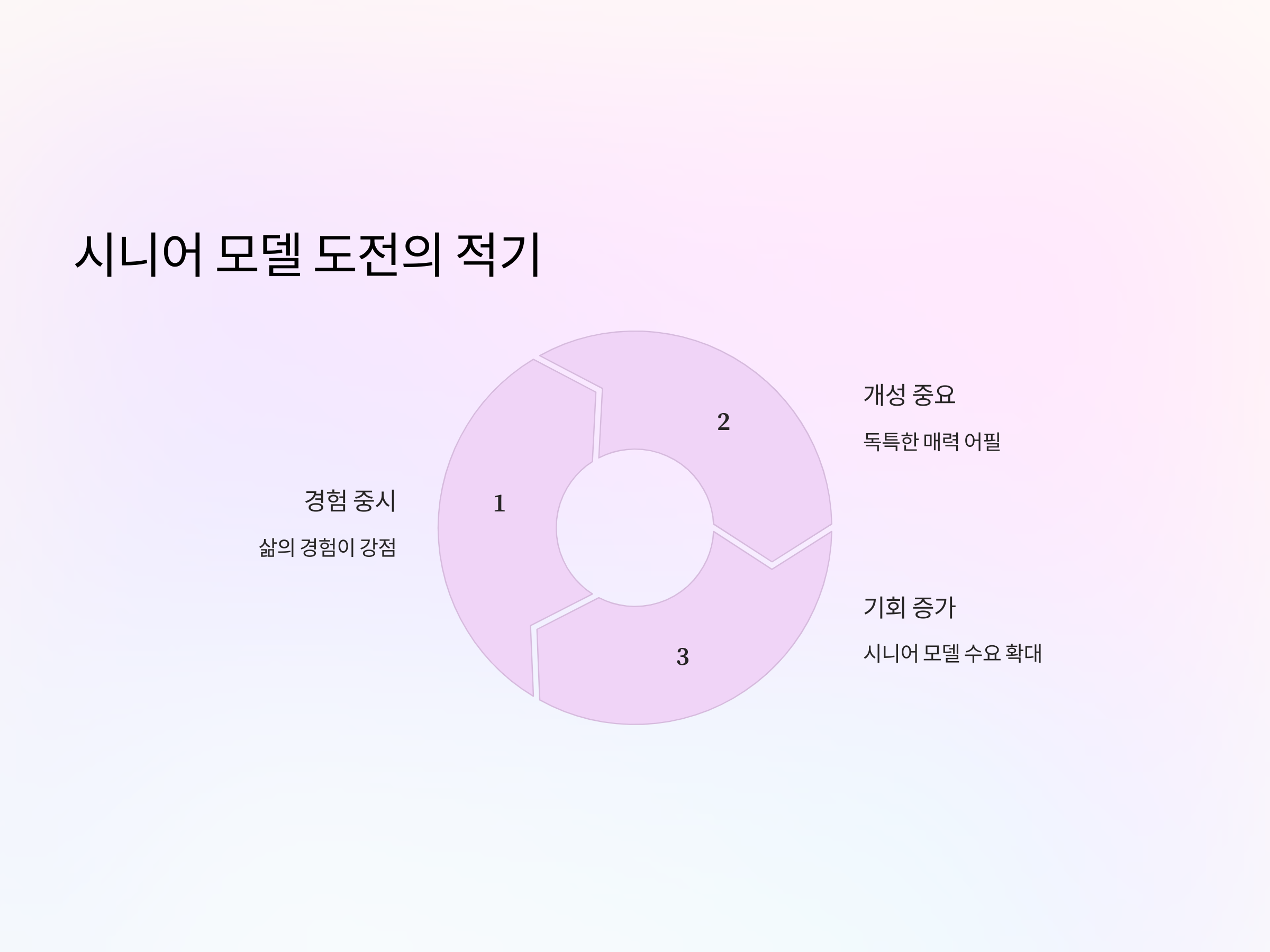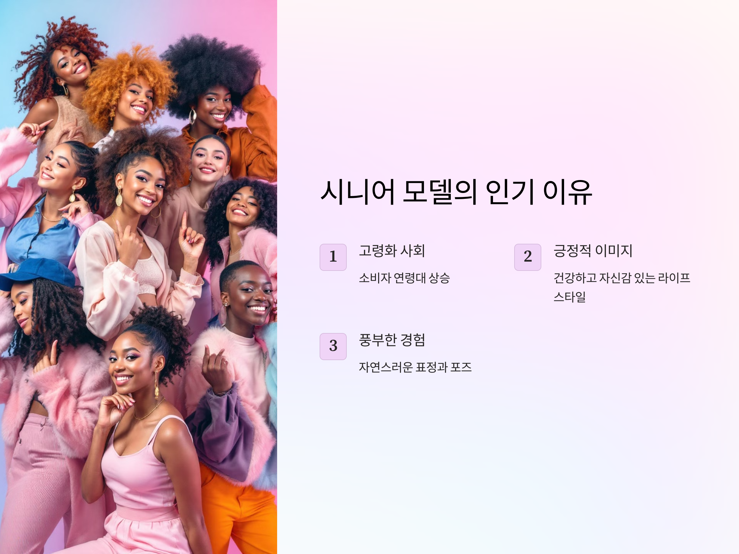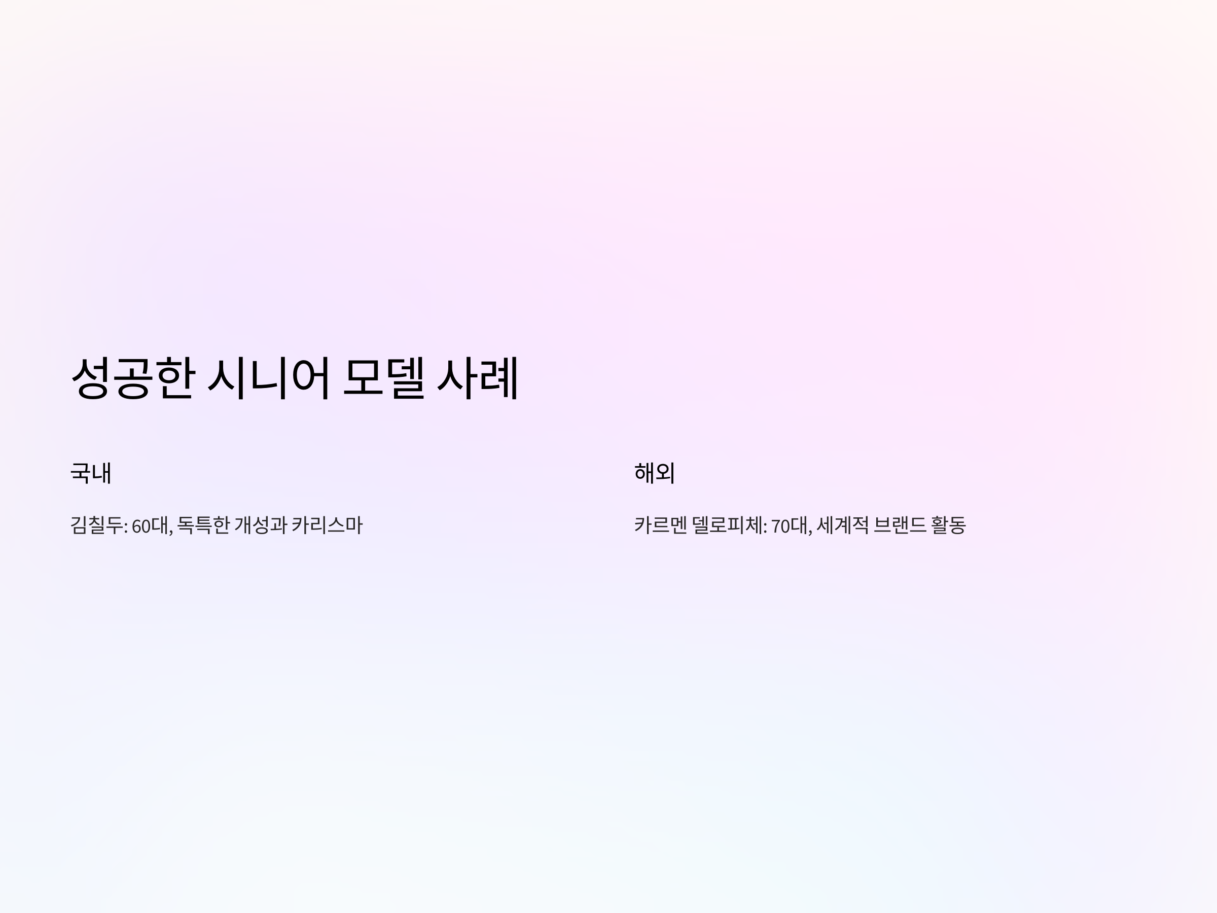 여전히 "모델은 젊어야 한다"는 편견이 존재한다. 하지만 최근 패션쇼와 광고에서 시니어 모델이 활약하는 사례가 늘어나고 있다. 자신만의 스타일과 개성을 갖추고 당당하게 도전하는 자세가 중요하다.