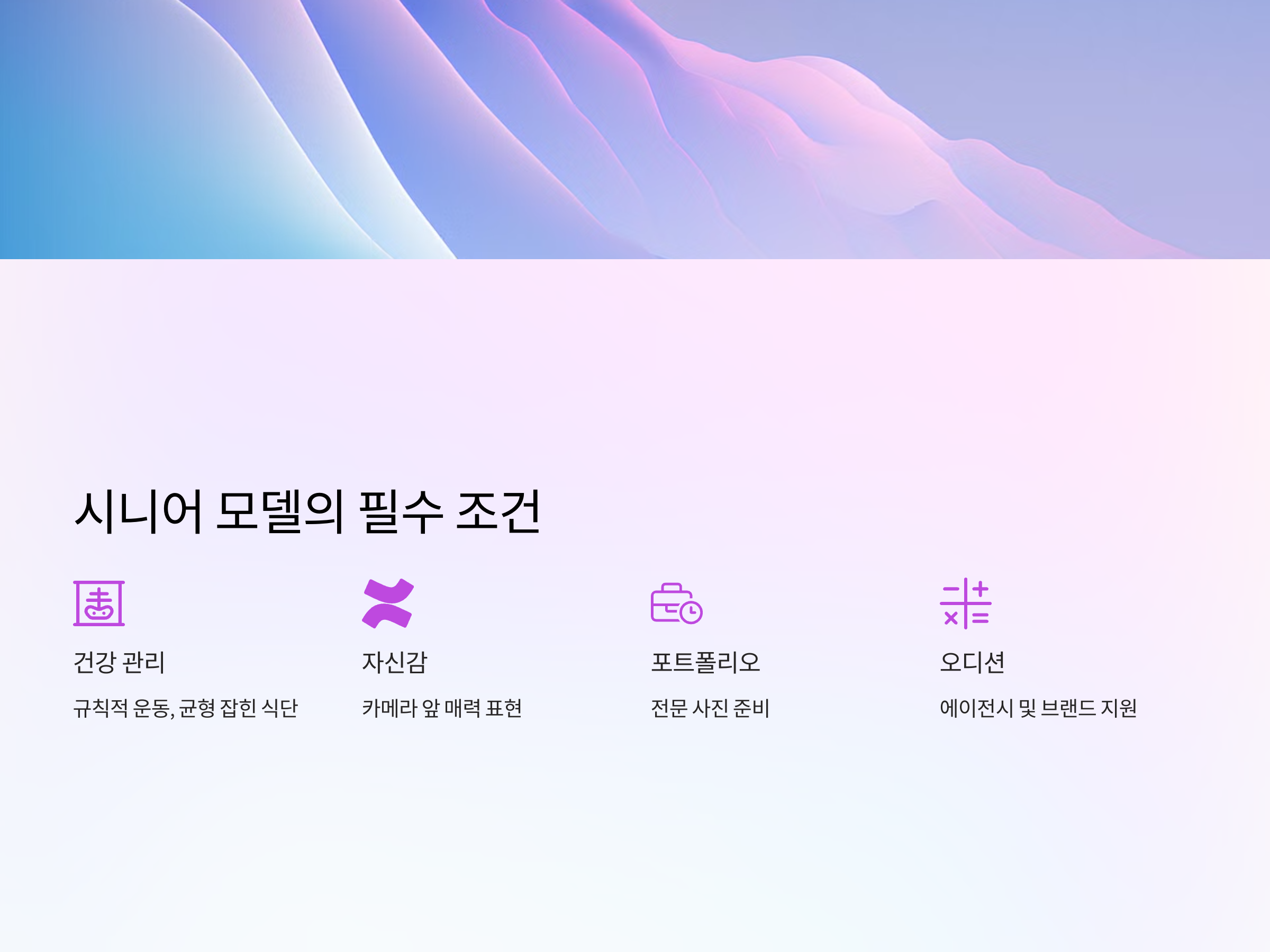 시니어 모델은 젊은 모델들과 달리 피부의 자연스러운 주름과 나이 든 모습도 중요한 요소가 된다. 하지만 기본적인 피부 관리와 건강 관리는 필수다. 규칙적인 운동과 균형 잡힌 식단을 유지하면 건강하고 활력 있는 이미지를 만들 수 있다.