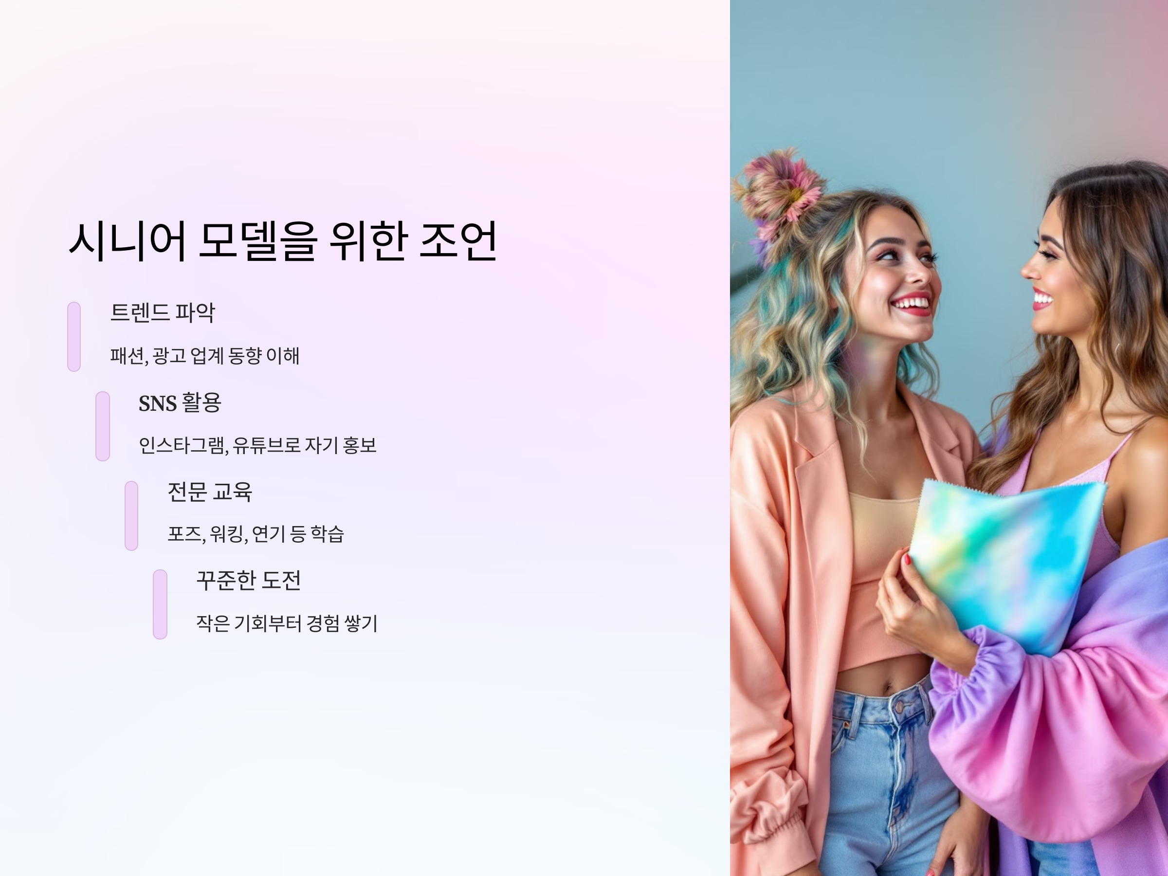 시니어 모델은 단순히 외모가 아니라 삶의 경험과 개성이 중요한 분야다. 따라서 지금부터 준비하고 도전하면 충분히 기회를 얻을 수 있다. 도전을 망설이고 있다면, 작은 것부터 시작해보자. 당신도 새로운 커리어를 시작할 수 있다!