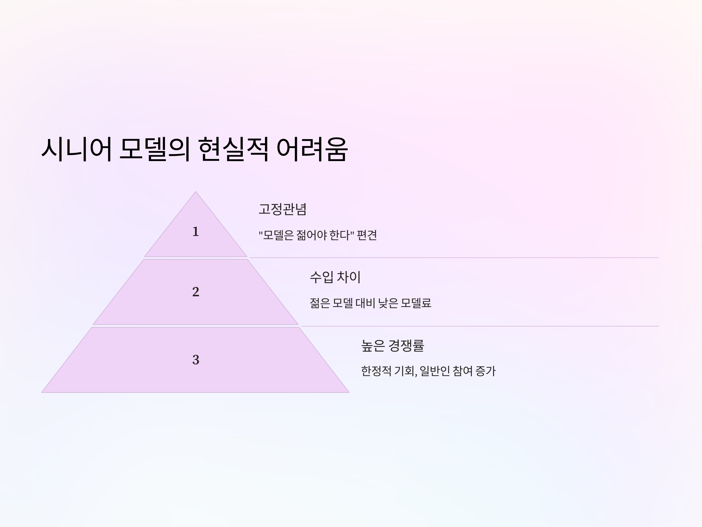 시니어 모델 시장이 성장하고 있지만, 여전히 기회는 한정적이다. 전문 모델이 아닌 일반인들도 관심을 가지면서 경쟁률이 높아지고 있다. 따라서 차별화된 개성과 매력을 어필하는 것이 중요하다.