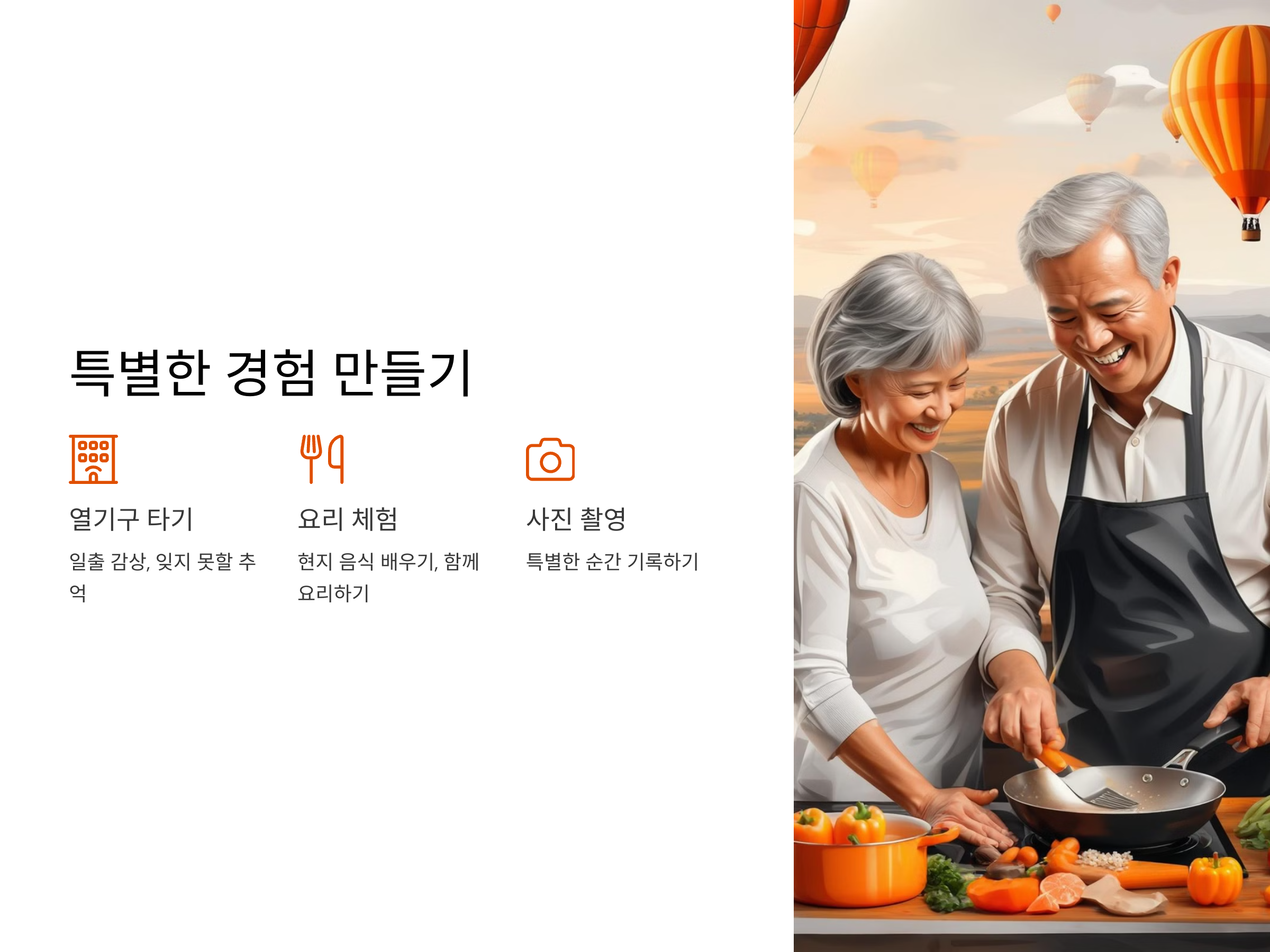 여행은 새로운 경험을 만들 수 있는 기회입니다. 특히 50대 이후에는 특별한 경험을 통해 더욱 기억에 남는 여행을 만들 수 있습니다. 배우자와 함께하는 여행에서는 평소에 하지 못했던 특별한 활동을 시도해보는 것도 좋습니다. 예를 들어, 맛집 탐방, 열기구 타기, 현지인의 집에서 전통 음식을 배우기, 함께 요리를 해보는 등 색다른 경험을 쌓을 수 있습니다.