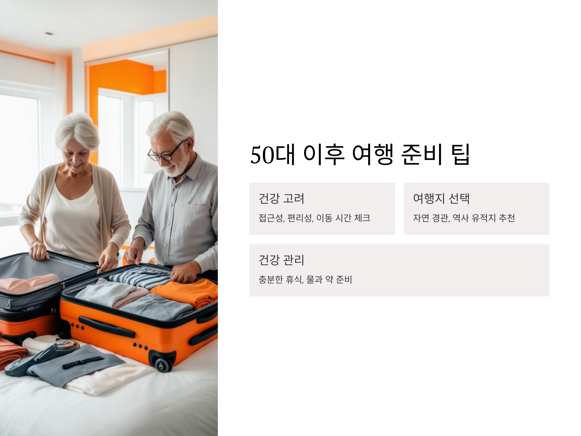 50대 이후 여행을 계획할 때는 건강을 최우선으로 고려해야 합니다. 여행지의 접근성, 숙박시설의 편리성, 이동 시간을 고려해 편안한 여행 계획을 세우는 것이 중요합니다.