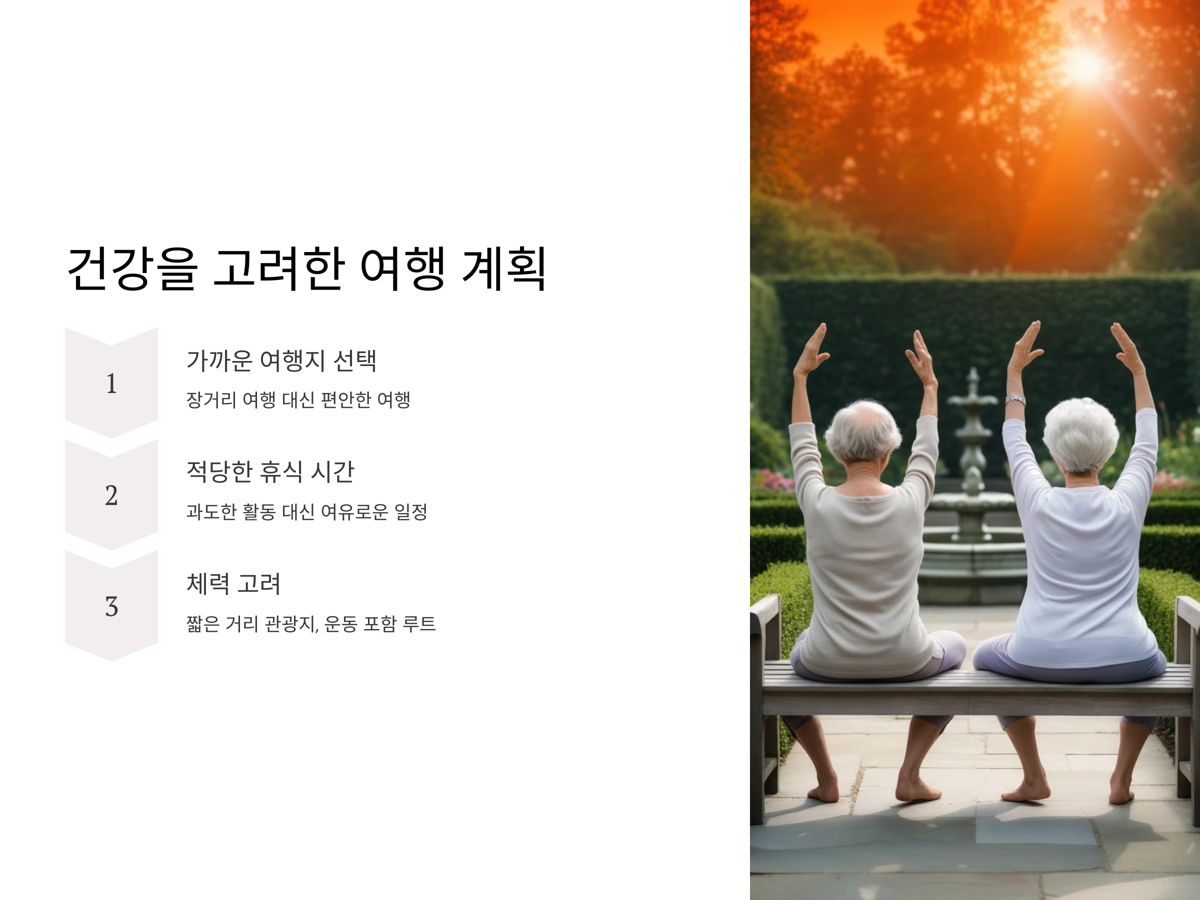50대 이후의 여행에서는 건강을 최우선으로 고려해야 합니다. 여행의 목적은 몸과 마음의 휴식이지만, 체력적인 문제가 발생할 수 있기 때문에 여행 계획을 세울 때 건강을 최우선에 두어야 합니다. 장거리 여행보다는 가까운 곳으로의 여행이 좋을 수 있으며, 이동 거리가 짧고 편안한 여행이 두 사람에게 더 적합할 수 있습니다.