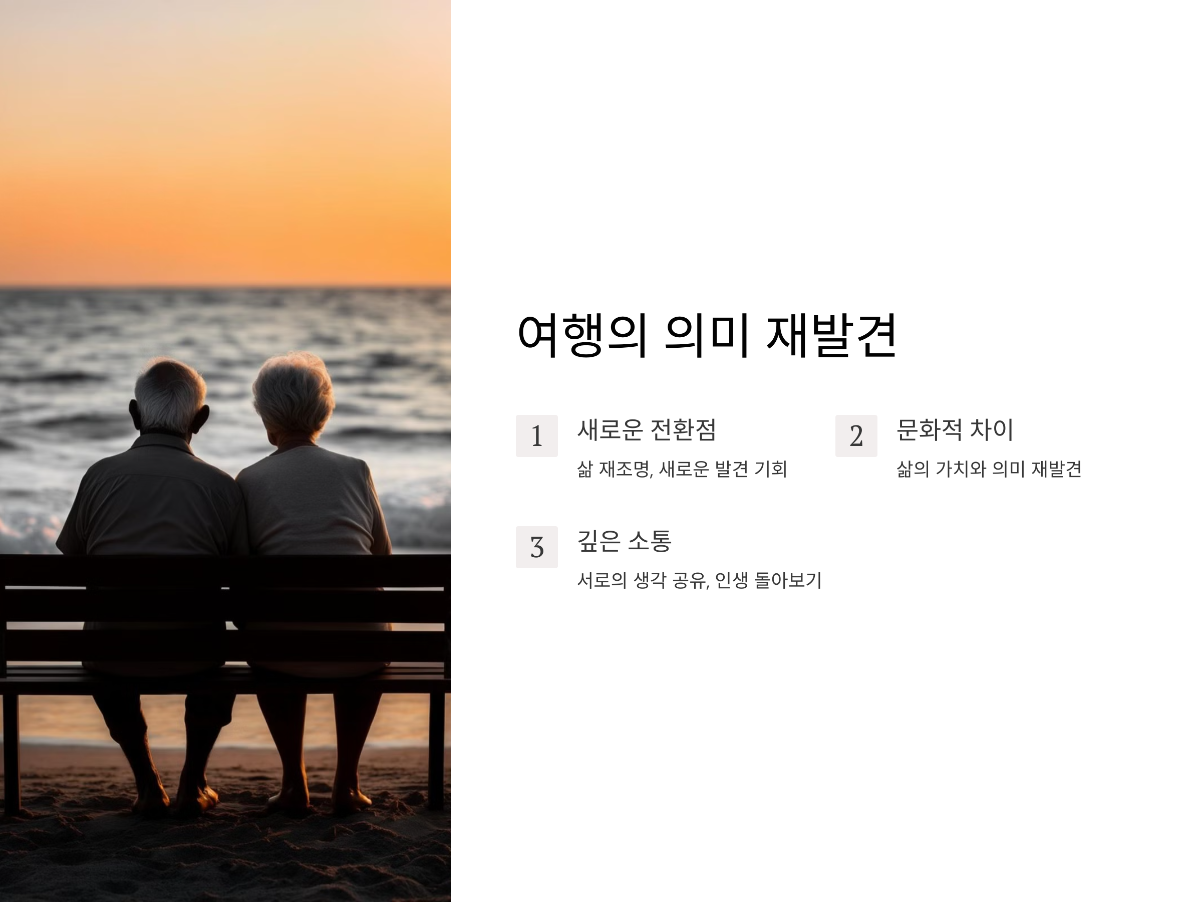 여행의 의미를 새롭게 정의하며, 더 깊은 소통을 나누는 시간을 가질 수 있습니다. 배우자와 함께하는 여행은 서로의 생각을 공유하고, 각자의 인생을 돌아보는 계기가 될 수 있습니다. 함께한 시간이 많을수록, 서로의 가치관이나 인생의 목표에 대해 다시 한번 고민해볼 수 있는 기회가 됩니다.