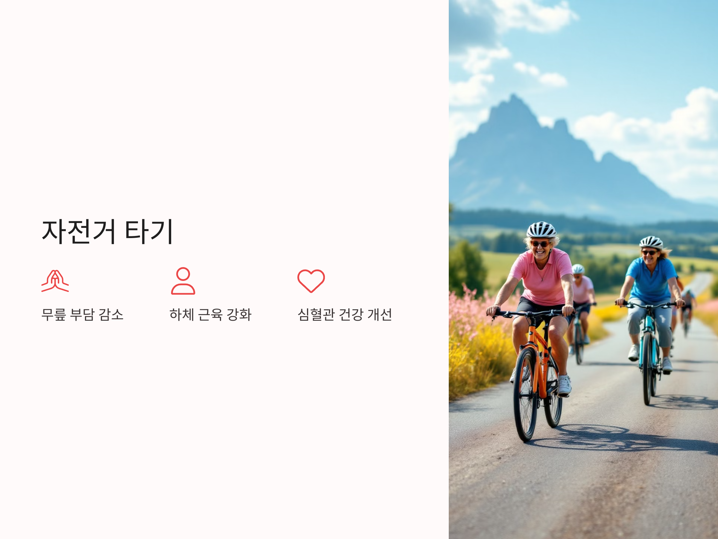 자전거는 50대 이후에도 무릎에 부담을 덜어주면서 체력을 기를 수 있는 훌륭한 레저 스포츠입니다. 자전거는 관절에 부담을 주지 않고 하체 근육을 효과적으로 강화할 수 있어 유산소 운동의 효과를 누릴 수 있습니다. 게다가 자전거는 속도나 거리 등을 자신이 조절할 수 있어, 체력에 맞춰 운동 강도를 조절할 수 있습니다.