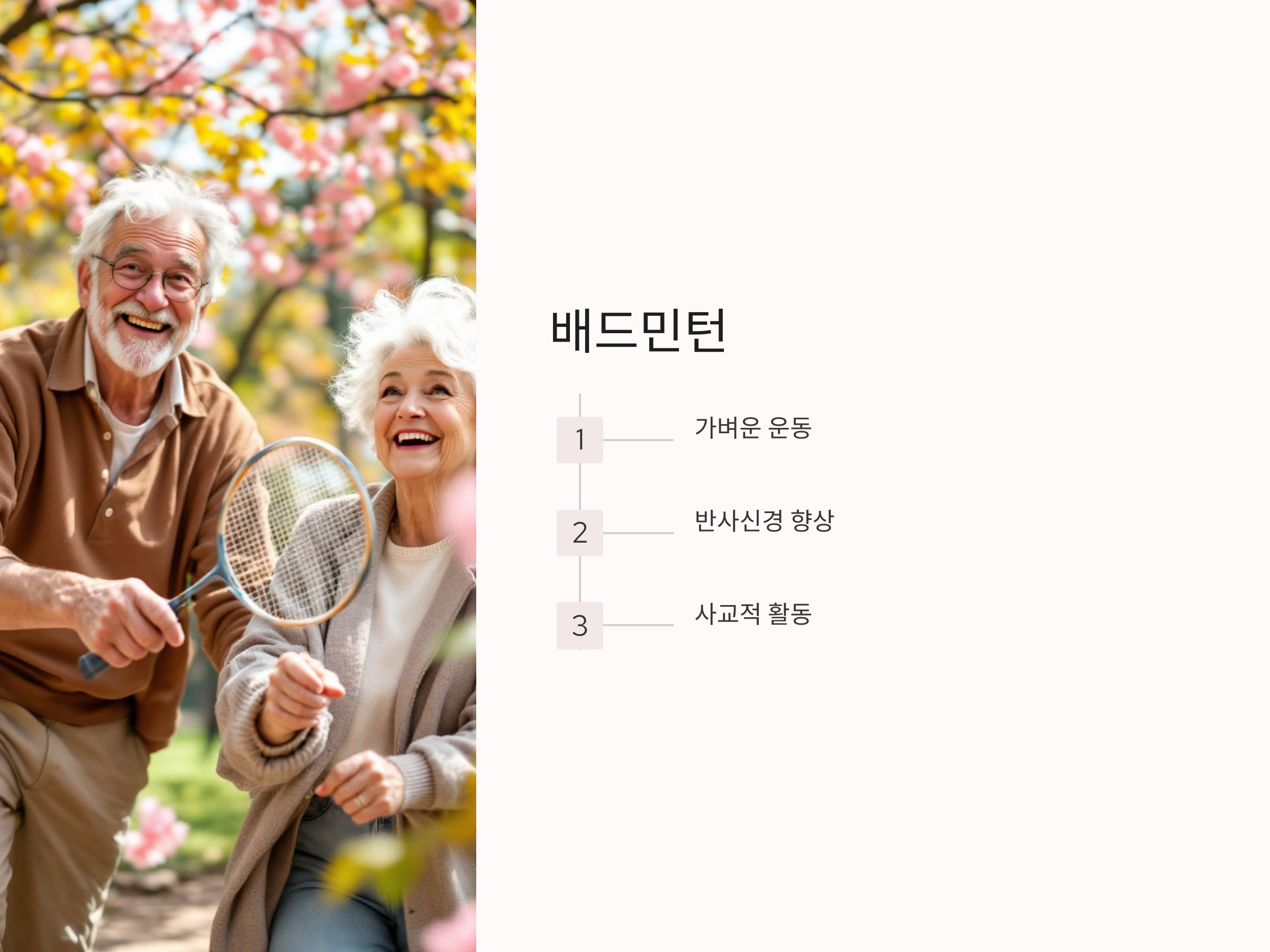 배드민턴은 50대 이후에도 가볍게 즐길 수 있는 스포츠입니다. 이 운동은 전신을 활용하며 반사 신경과 민첩성을 높이는 데 효과적입니다. 배드민턴은 큰 운동량을 요구하지 않지만, 꾸준히 하면 체력을 기를 수 있으며, 빠른 발과 손 움직임을 통해 운동 효과를 높일 수 있습니다.