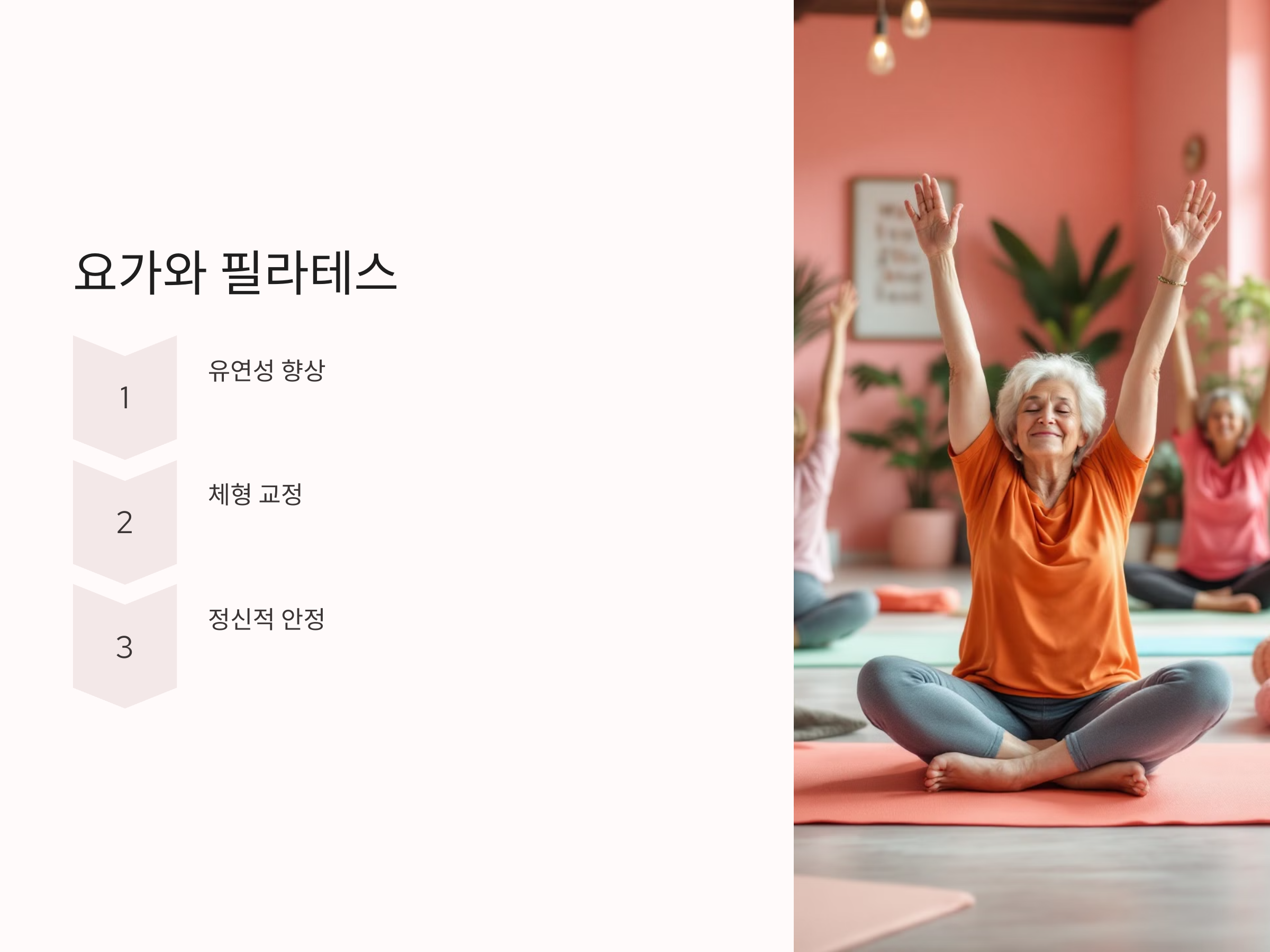 요가와 필라테스는 유연성을 향상시키는 데 좋으며, 스트레스 해소에도 큰 도움이 됩니다. 다양한 동작을 통해 근육을 이완시키고, 정적인 운동을 통해 몸과 마음의 균형을 맞출 수 있습니다.