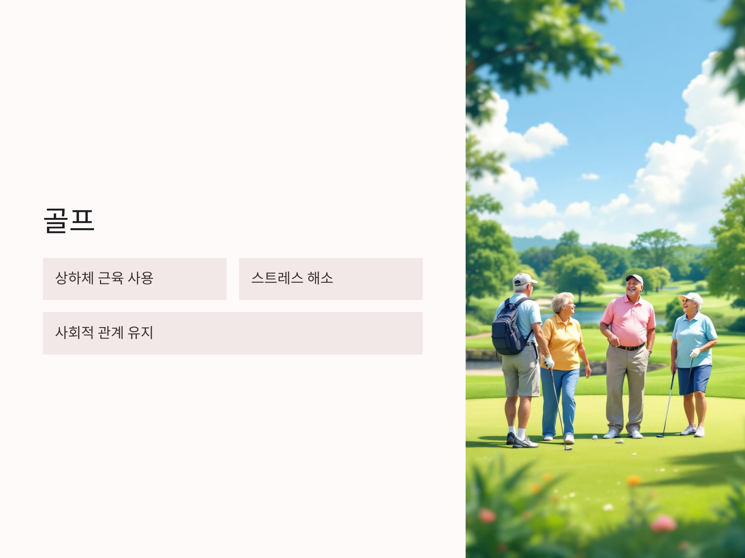 골프는 50대 이후에도 매우 인기 있는 레저 스포츠입니다. 골프는 몸에 무리가 가지 않으면서도 상체 근육과 하체 근육을 고루 사용해 체력을 기를 수 있습니다. 또한, 골프는 상대적으로 부드러운 운동이기 때문에 부담 없이 즐기기 좋습니다.