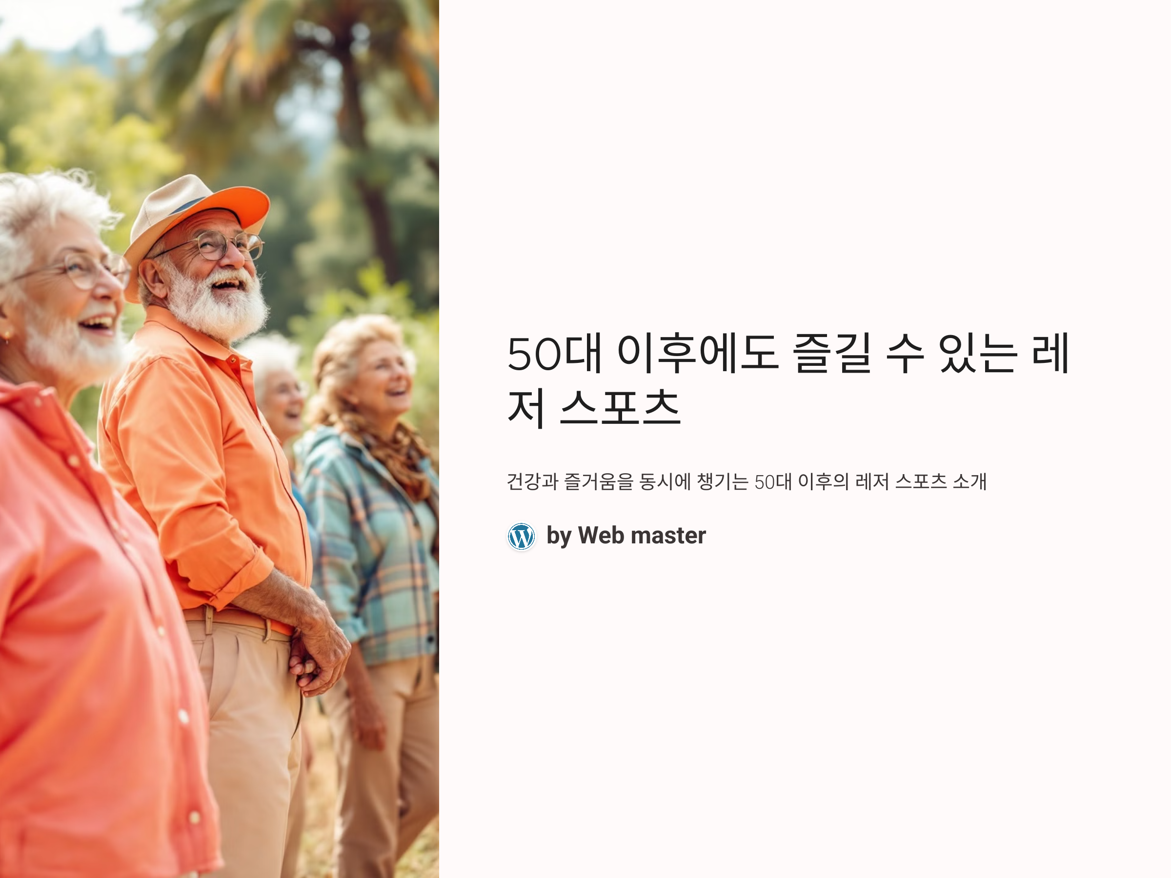 50대 이후에도 즐길 수 있는 레저 스포츠는 다양하고, 어떤 운동을 선택하느냐에 따라 건강에 미치는 효과도 달라집니다. 자신에게 맞는 운동을 찾아 꾸준히 하면서 건강을 유지하고, 새로운 취미를 즐기는 것은 삶의 질을 높이는 중요한 방법이 될 것입니다. 건강한 생활을 위해 지금 바로 레저 스포츠를 시작해보세요!