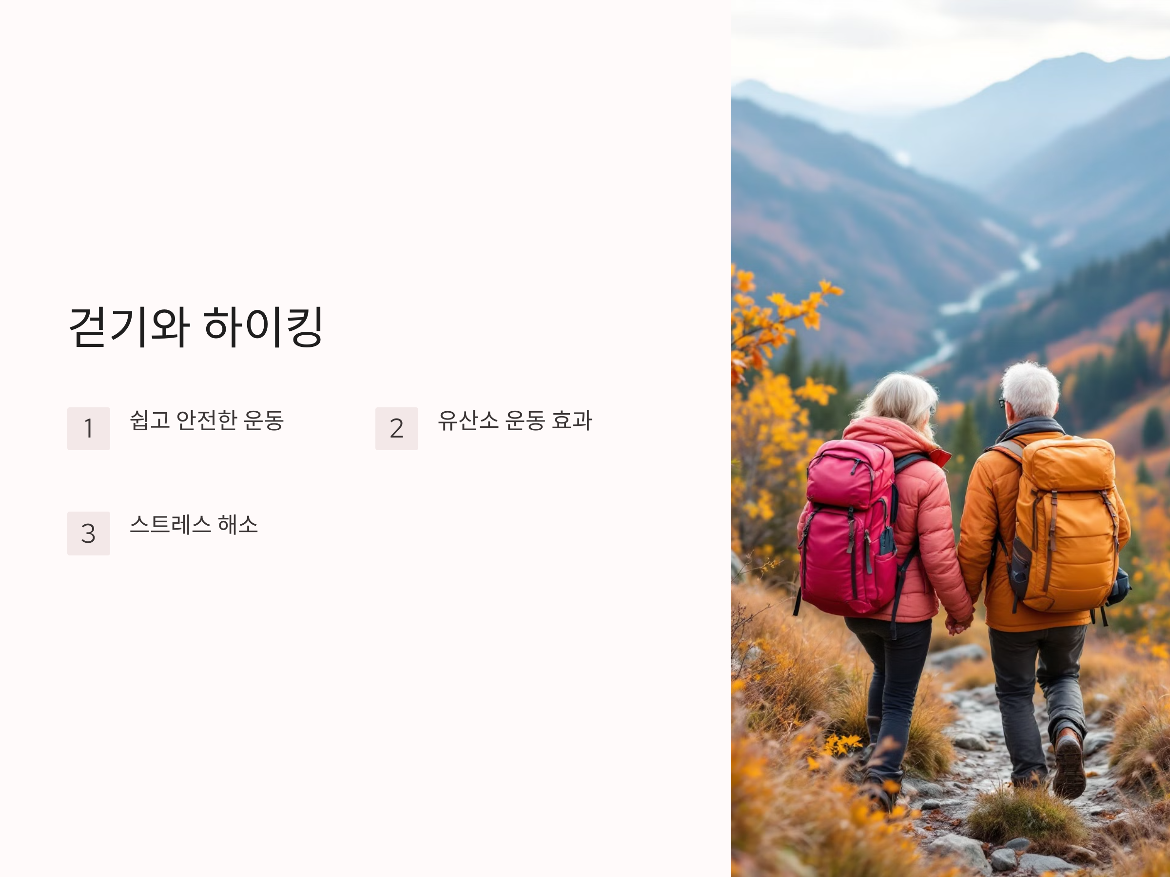 걷기나 하이킹은 50대 이후에도 누구나 쉽게 즐길 수 있는 운동입니다. 걷기는 체력에 부담을 주지 않으면서도 유산소 운동 효과를 높여줄 수 있기 때문에 건강에 아주 좋습니다. 특히 자연 속에서 하는 하이킹은 스트레스를 해소하고, 기분을 전환하는 데 큰 도움이 됩니다.