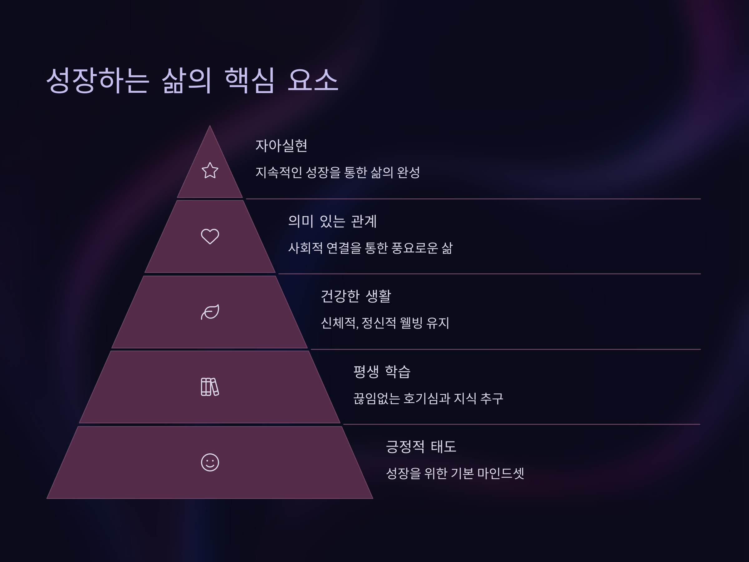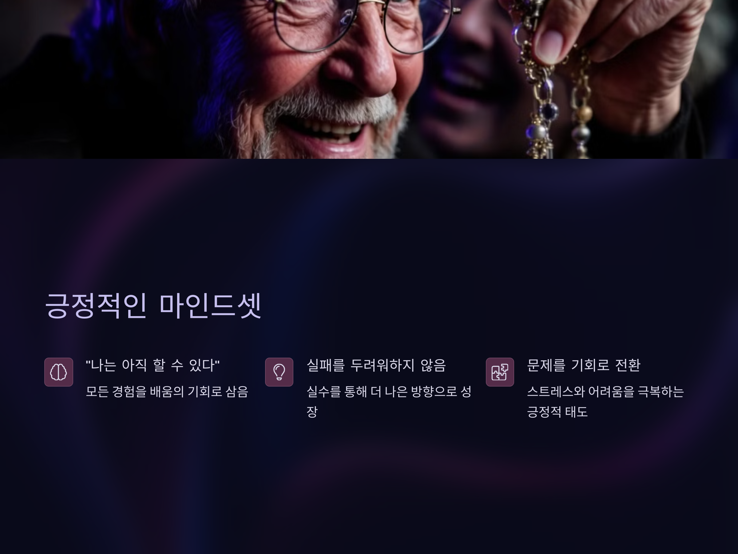 50대 이후의 삶에서 긍정적인 마인드셋을 유지하는 것은 매우 중요합니다. 나이가 들수록 과거의 경험에 얽매이기 쉽고, 새로운 도전을 두려워하기도 합니다. 그러나 지속적으로 성장하는 사람들은 긍정적인 마인드를 유지하며, 인생의 모든 경험을 배우고 성장하는 기회로 삼습니다. 이들은 "나는 아직 할 수 있다"는 마음가짐을 가지고 있으며, 실수와 실패를 두려워하지 않고, 그것을 통해 더 나은 방향으로 나아갈 수 있다고 믿습니다.