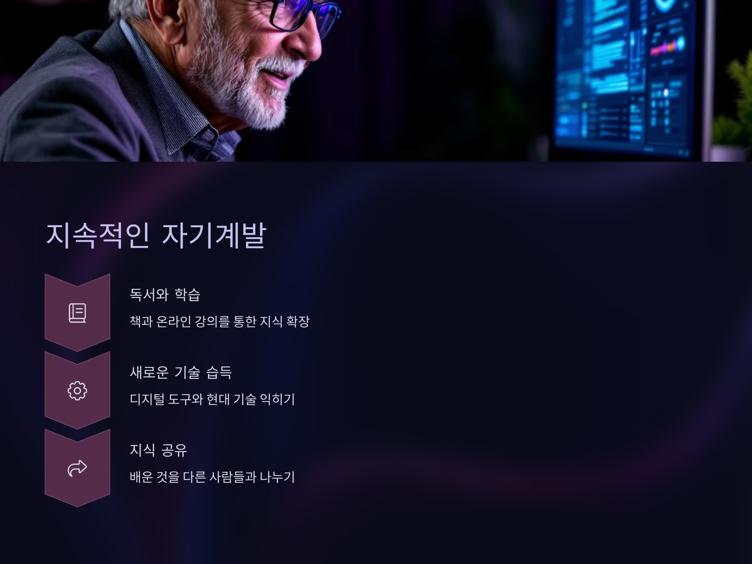 이런 자기계발의 중요성은 직업적인 면뿐만 아니라 개인적인 삶에서도 중요한 영향을 미칩니다. 50대 이후에도 계속해서 배우고 성장하는 사람들은 사회적, 정신적, 정서적 측면에서 더욱 풍성한 삶을 살아갈 수 있습니다. 이들은 자신이 좋아하는 일을 추구하면서, 자신만의 지식과 경험을 넓히고 이를 다른 사람들과 나누는 것을 중요하게 생각합니다.