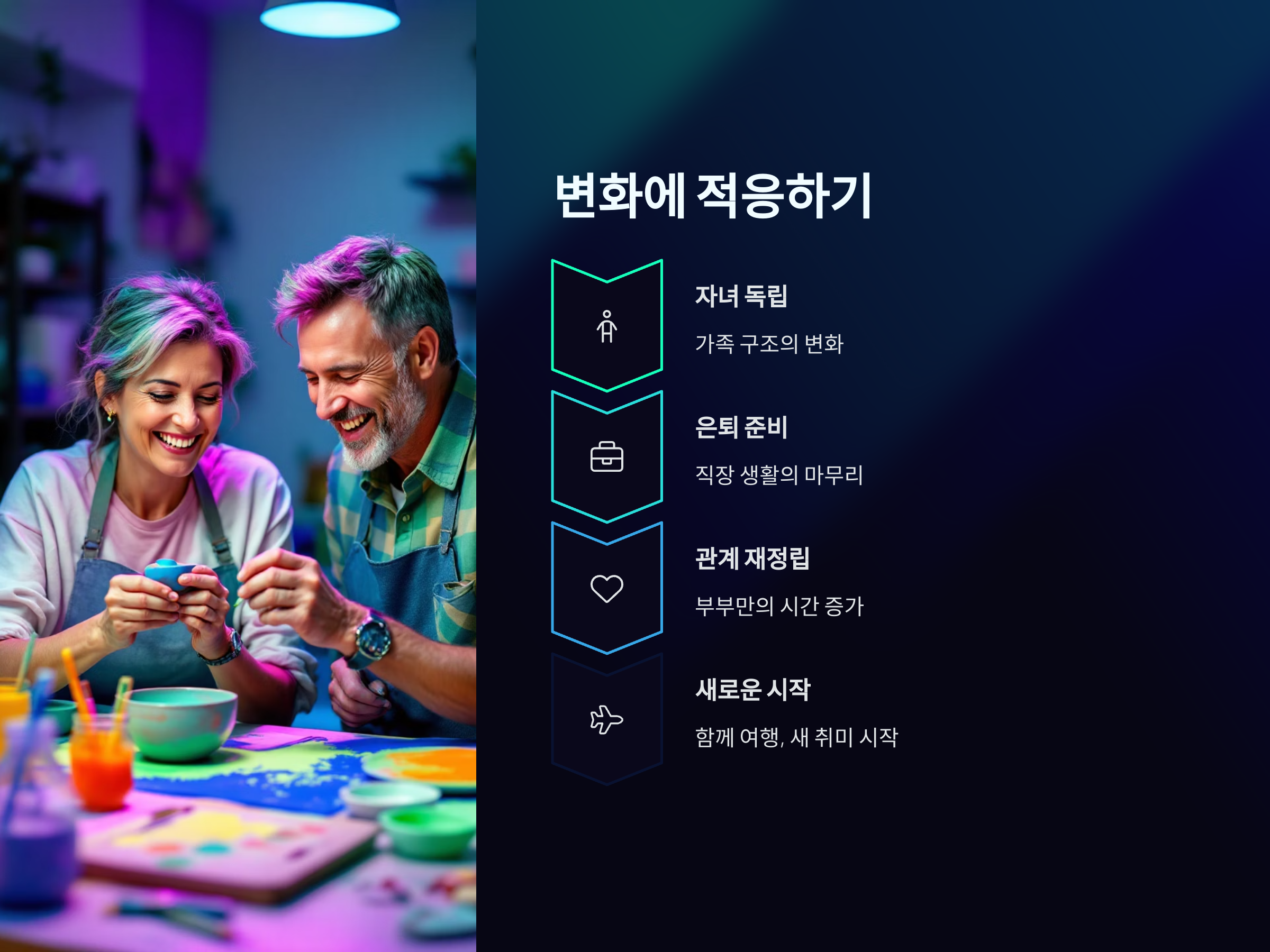 50대는 인생의 큰 전환점을 의미합니다. 자녀들이 독립하고, 직장에서 은퇴를 맞이하면서 부부 관계에도 많은 변화가 일어날 수 있습니다. 그동안 바쁜 일상 속에서 상대방과의 대화가 줄어들었을 수 있습니다. 이제는 함께 보내는 시간이 많아질 때이기 때문에, 변화에 잘 적응하고 서로의 필요를 이해하는 것이 중요합니다. 이 시기에는 함께 여행을 떠나거나 새로운 취미를 시작하는 것도 좋은 방법입니다. 일상의 변화를 긍정적으로 받아들이고, 서로의 새로운 관심사에 대해 대화하는 것이 관계를 더욱 깊어지게 만듭니다.