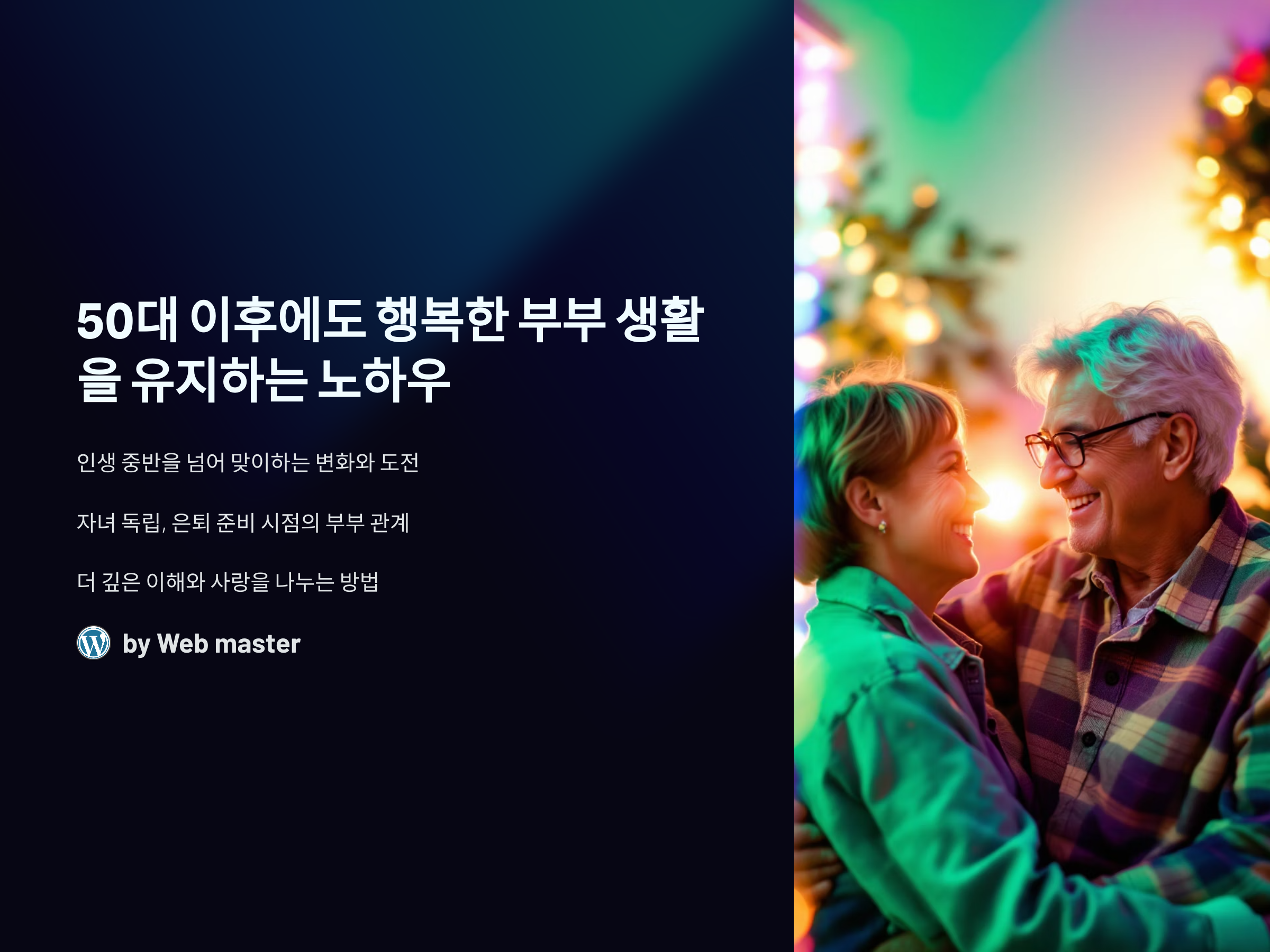 50대 이후, 인생의 중반을 넘기면서 많은 부부가 직면하는 변화와 도전에 대해 이야기해봅니다. 자녀들이 독립하고, 은퇴를 준비하는 시점에 이르면 부부 간의 관계도 다시 한번 돌아볼 필요가 있습니다. 이 시기에 부부가 서로 더 깊은 이해와 사랑을 나누기 위해서는 몇 가지 중요한 요소들이 있습니다. 이번 포스트에서는 50대 이후에도 행복한 부부 생활을 유지하는 노하우에 대해 공유하고자 합니다. 이 노하우들을 통해 더 깊은 소통과 행복한 삶을 이어갈 수 있을 것입니다.