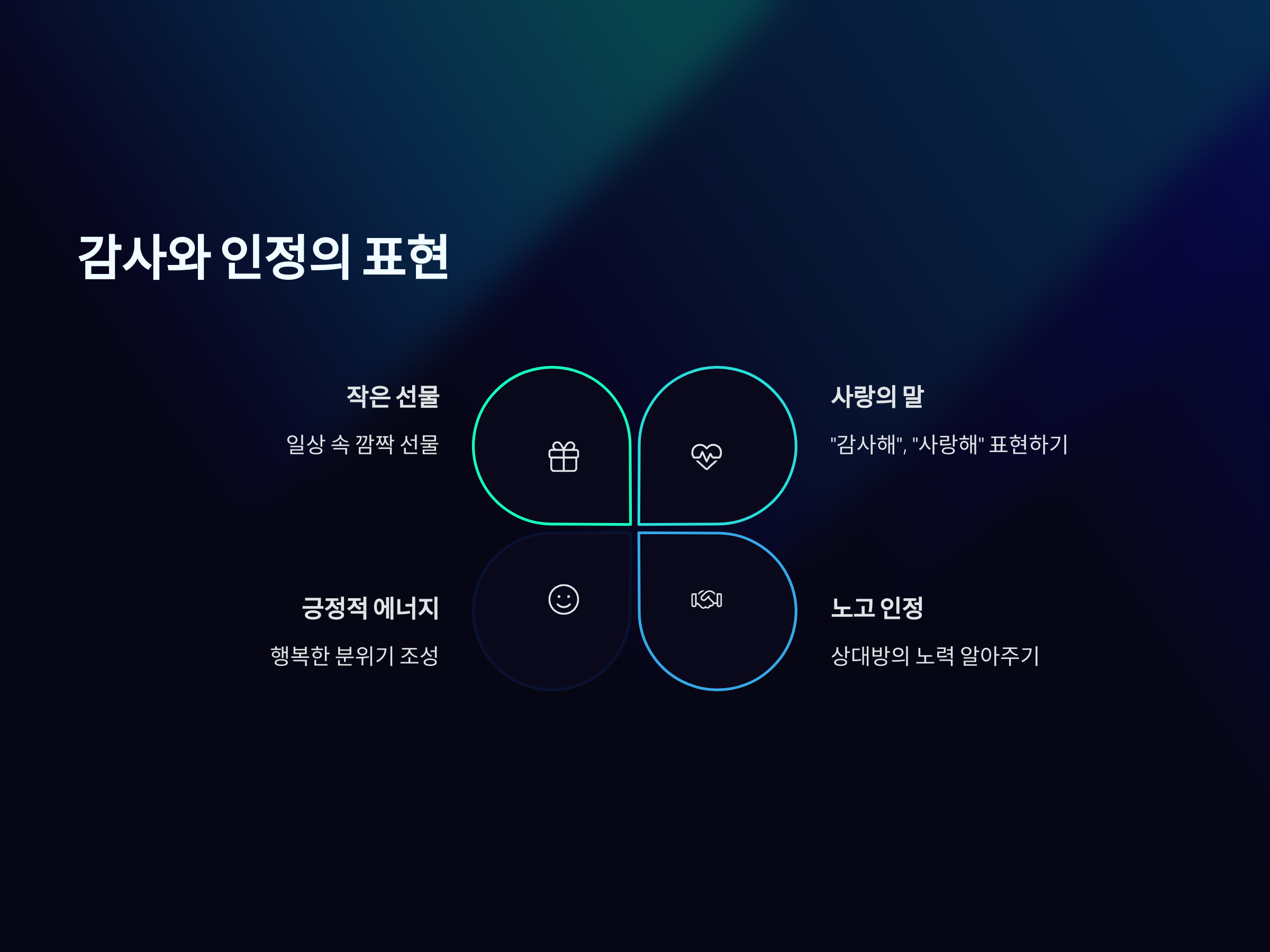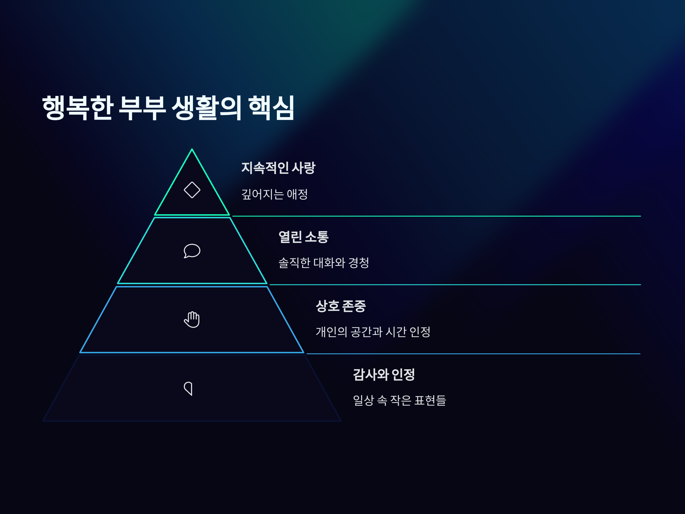 부부 관계에서 가장 중요한 것은 감사와 인정의 표현입니다. 50대 이후에는 그동안 서로의 노고를 인정하고 감사하는 마음을 표현하는 것이 필요합니다. 작은 일에도 고마움을 표현하고, 상대방의 노력과 사랑을 인정하는 것은 긍정적인 에너지를 만들어냅니다. "감사해", "사랑해"라는 말 한마디로도 관계는 더욱 깊어질 수 있습니다. 때로는 특별한 날뿐만 아니라, 일상 속에서 상대방에게 작은 선물이나 따뜻한 말을 건네는 것이 부부 간의 관계를 더욱 돈독하게 만듭니다.