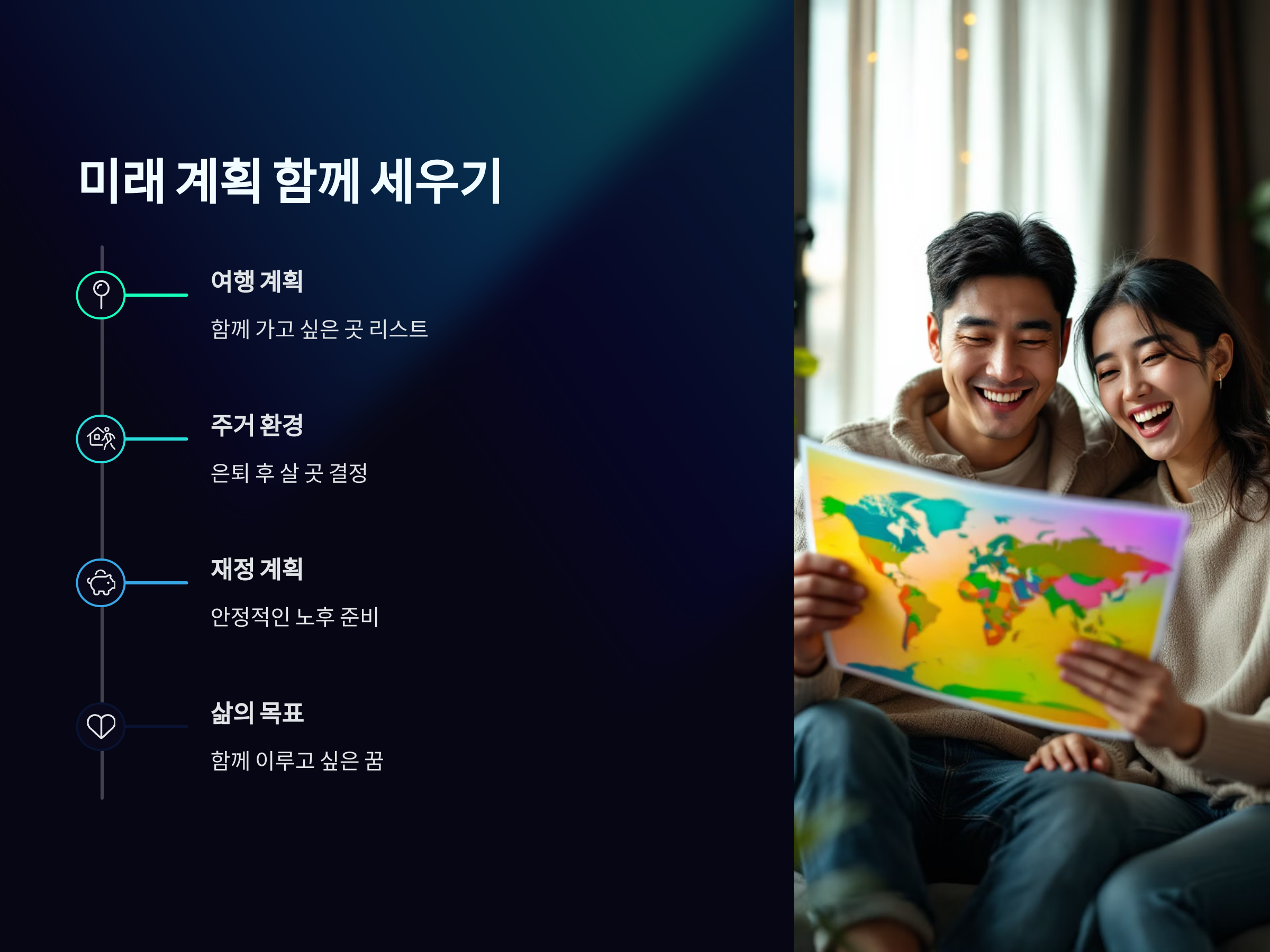 부부가 함께하는 인생의 후반전에서 중요한 점은 앞으로의 계획을 함께 세우는 것입니다. 50대 이후에도 여전히 다양한 가능성과 목표가 존재합니다. 함께 여행을 떠나고, 새로운 경험을 쌓는 것부터 은퇴 후의 계획까지, 두 사람의 미래를 함께 그려보는 것이 중요합니다. 함께 계획을 세우고, 서로의 꿈을 지지하며 지원하는 관계는 더욱 행복하고 강한 부부 생활을 만들어 갑니다.