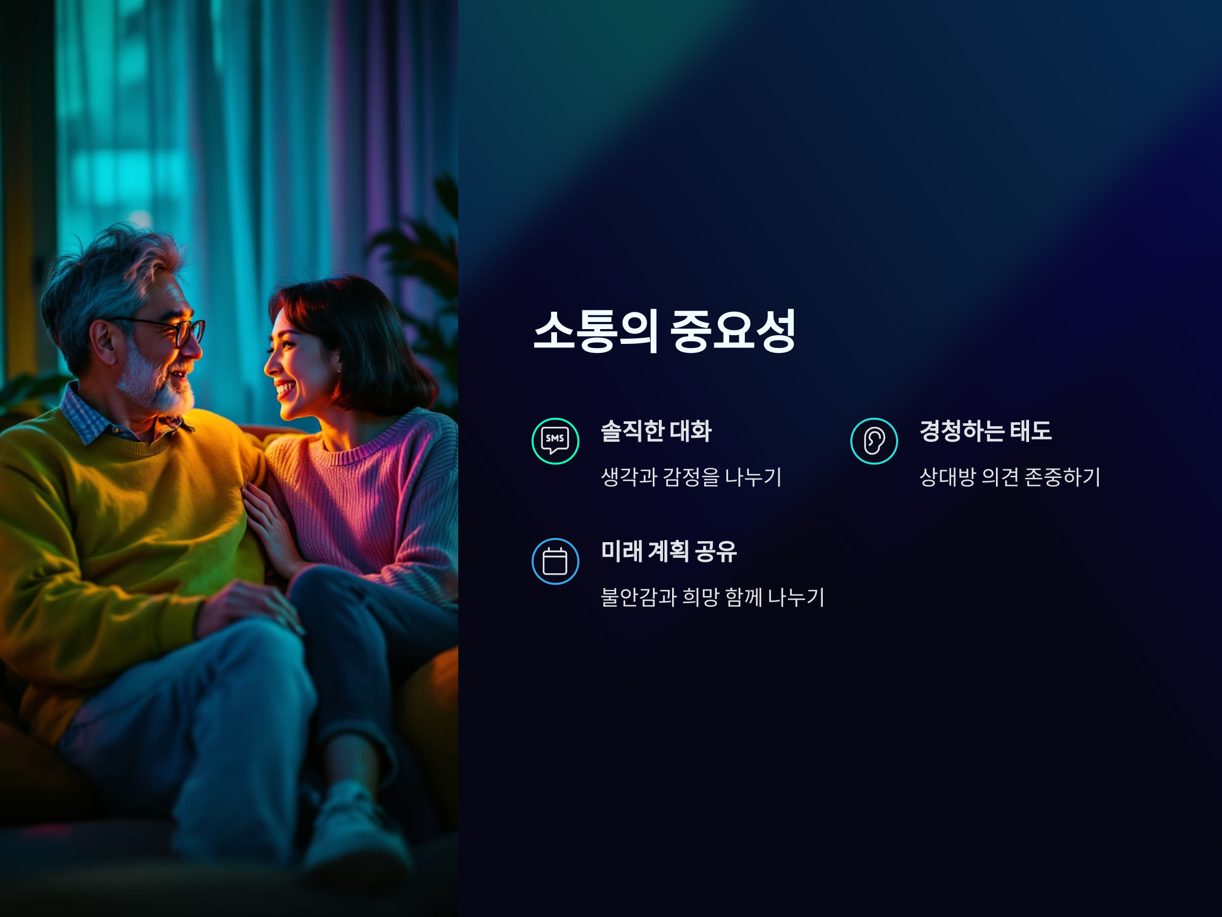 부부 사이의 행복은 소통에 달려있다고 해도 과언이 아닙니다. 50대 이후에는 자녀들이 독립하면서 부부만의 시간이 많아지지만, 그동안 쌓였던 대화의 부재가 문제가 될 수 있습니다. 서로의 생각과 감정을 솔직하게 나누는 것이 중요합니다. 단순히 일상적인 대화뿐만 아니라, 감정이나 미래에 대한 불안감도 함께 나누는 것이 필요합니다. 서로의 의견을 존중하고, 때로는 상대방의 말을 경청하는 태도가 관계를 더욱 강화할 수 있습니다.