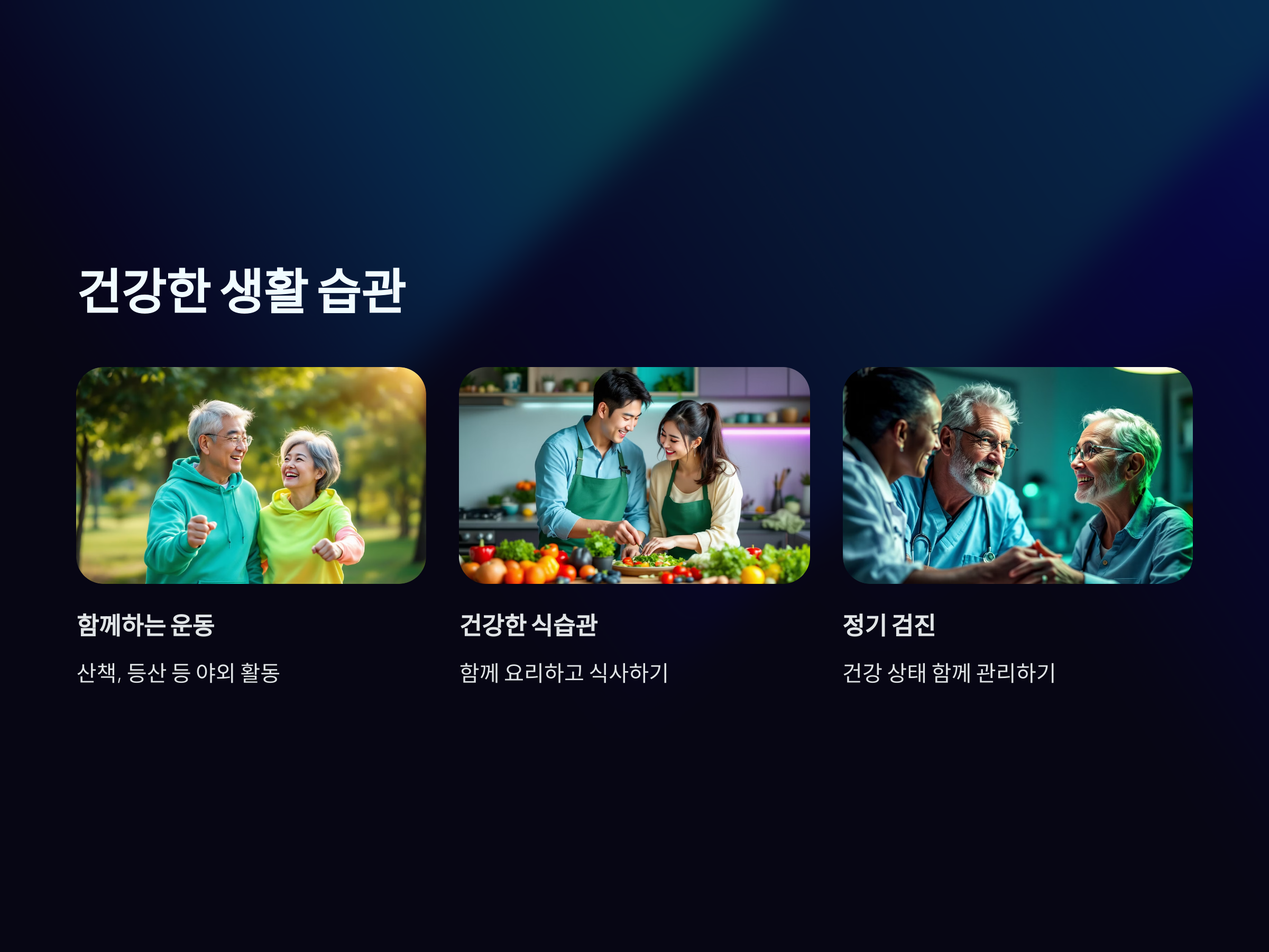 50대 이후에는 건강 관리가 중요해집니다. 부부가 함께 운동하거나 건강한 식습관을 공유하는 것은 두 사람의 관계를 더욱 강화할 수 있는 좋은 방법입니다. 함께 운동을 하거나, 취미로 산책을 즐기며 건강을 챙기면, 자연스럽게 유대감도 더욱 강화됩니다. 건강한 생활을 통해 몸과 마음이 모두 건강해지면, 두 사람은 함께 더 오래 행복한 시간을 보낼 수 있을 것입니다.