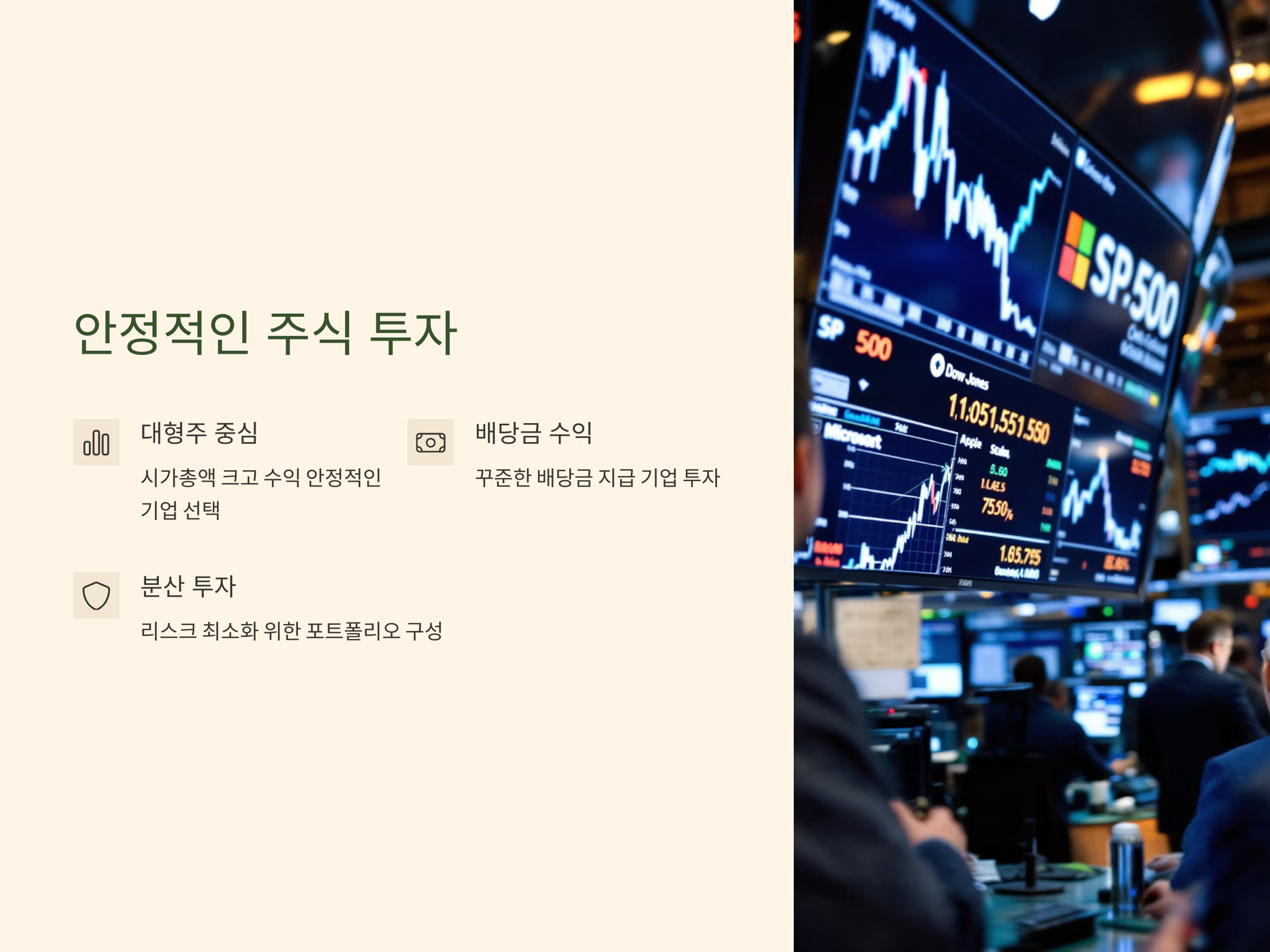 50대 이후에도 주식 투자는 여전히 중요한 투자 수단이 될 수 있습니다. 하지만 과거처럼 고위험의 성장주보다는 안정적인 대형주를 중심으로 투자하는 것이 좋습니다. 대형주는 시가총액이 크고, 매출과 수익이 안정적인 기업들입니다. 대표적인 예로는 삼성전자, 현대자동차와 같은 국내 대형기업이 있습니다.