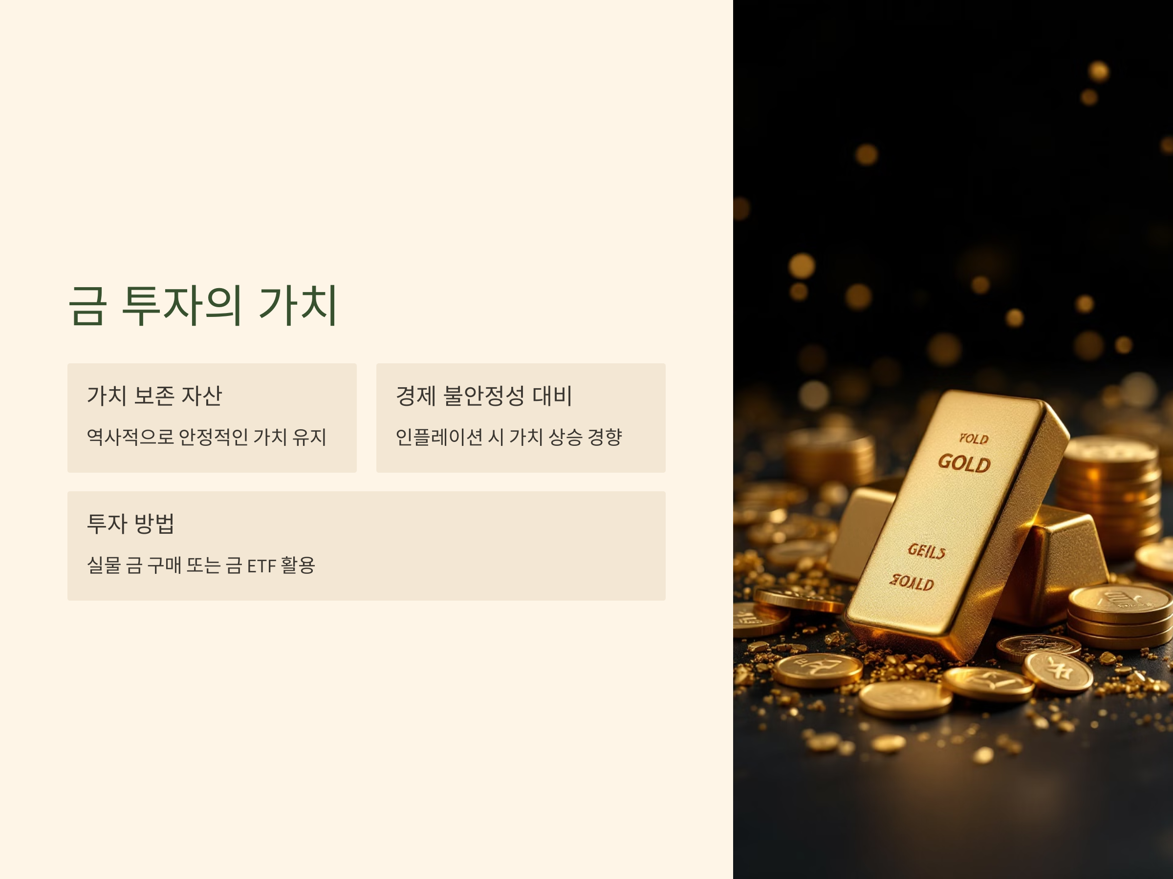 금 투자 방법은 직접 금을 구매하거나, 금 ETF와 같은 금융 상품을 통해 투자할 수 있습니다. 금을 직접 보유하는 방법은 물리적으로 금을 안전하게 보관할 수 있는 장소가 필요하지만, ETF는 상대적으로 관리가 용이하며, 금에 대한 투자 리스크를 분산할 수 있습니다.