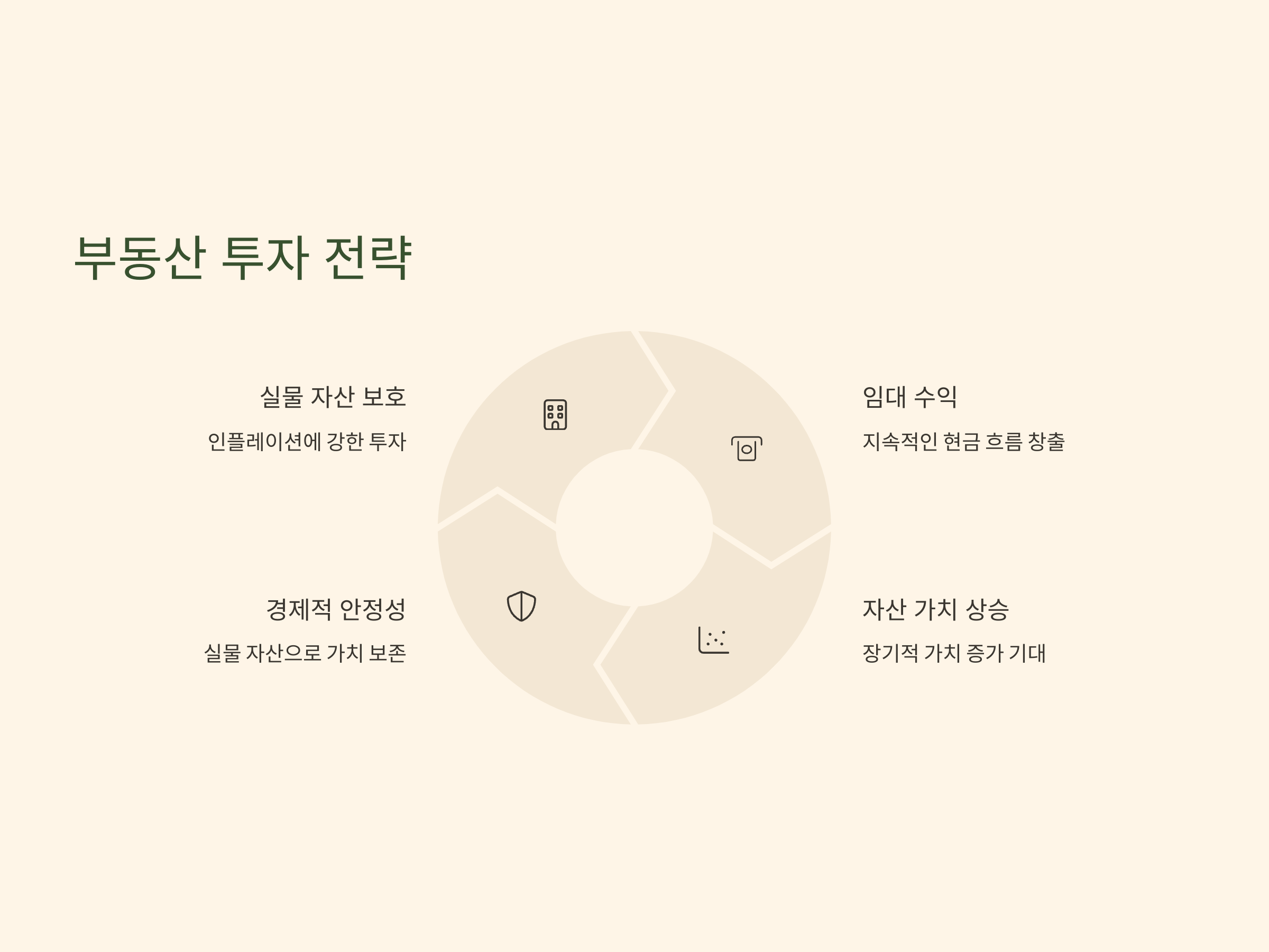 부동산은 오랫동안 안정적인 자산으로 평가되어 온 투자 방법입니다. 특히 50대 이후에는 실물 자산을 통해 자산을 보호하고, 임대수익을 창출할 수 있는 기회가 많습니다. 부동산은 물가 상승과 함께 가치가 오를 가능성이 있기 때문에, 안정적인 자산으로서의 역할을 할 수 있습니다.