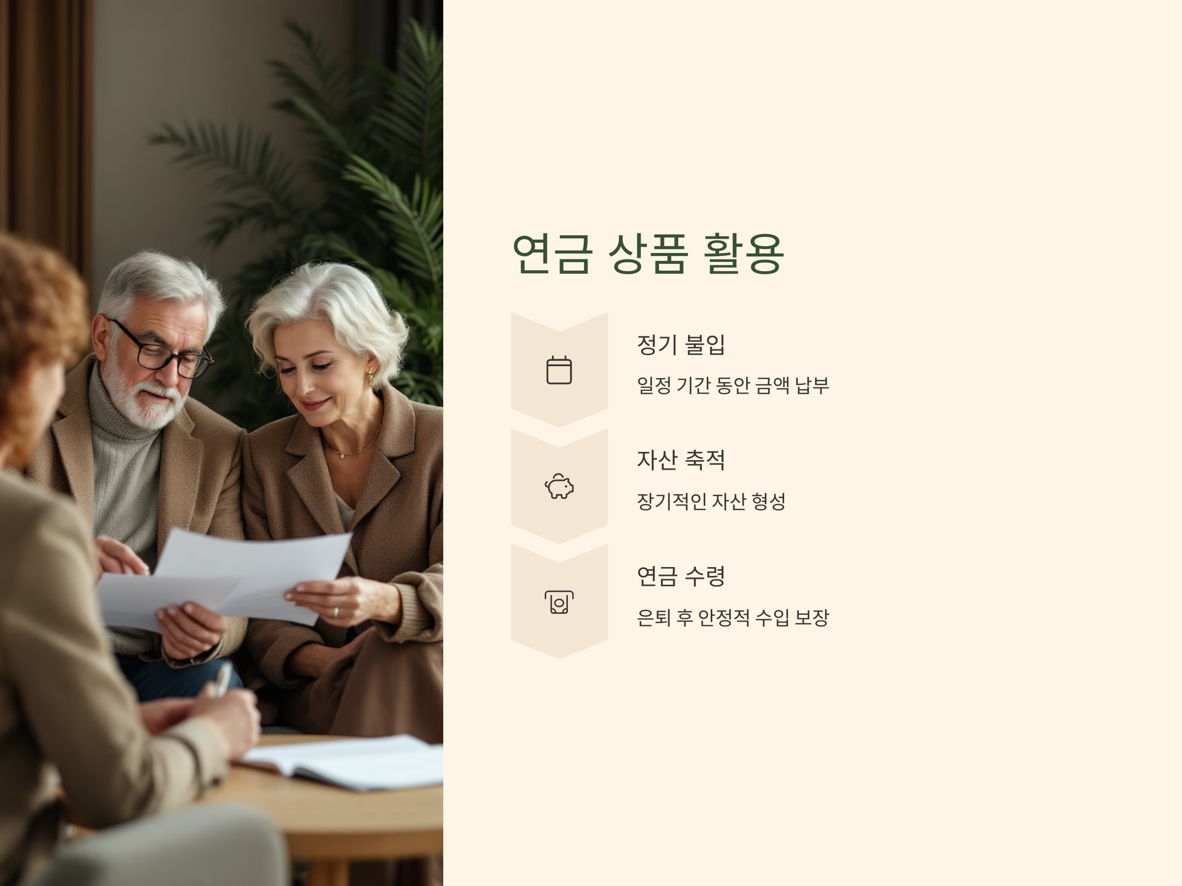 연금 상품은 은퇴 후 안정적인 수입을 보장해 주는 중요한 투자 방법입니다. 특히 50대 이후에는 연금 상품을 활용하여 노후를 대비하는 것이 매우 중요합니다. 연금은 일정 기간 동안 일정 금액을 불입하고, 나중에 일정 금액을 연금으로 수령하는 방식으로 운영됩니다. 연금 상품은 안정적인 수익을 제공하며, 정부의 지원을 받을 수 있는 경우도 있어 안정적인 선택이 될 수 있습니다.