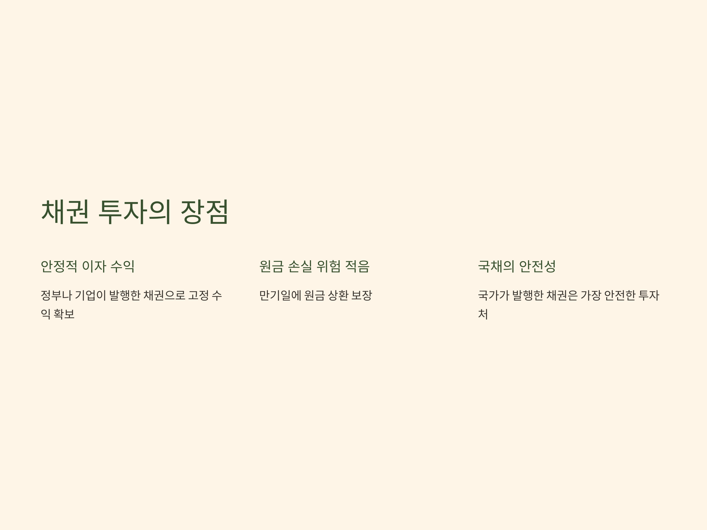 채권은 안정적인 이자 수익을 제공하는 투자 방법입니다. 정부나 기업이 발행하는 채권을 구매하면, 일정 기간 동안 이자 수익을 얻을 수 있습니다. 50대 이후의 투자자는 채권을 통해 안정적인 현금 흐름을 확보할 수 있습니다. 특히 국가가 발행한 국채는 가장 안전한 투자처로 평가받습니다.