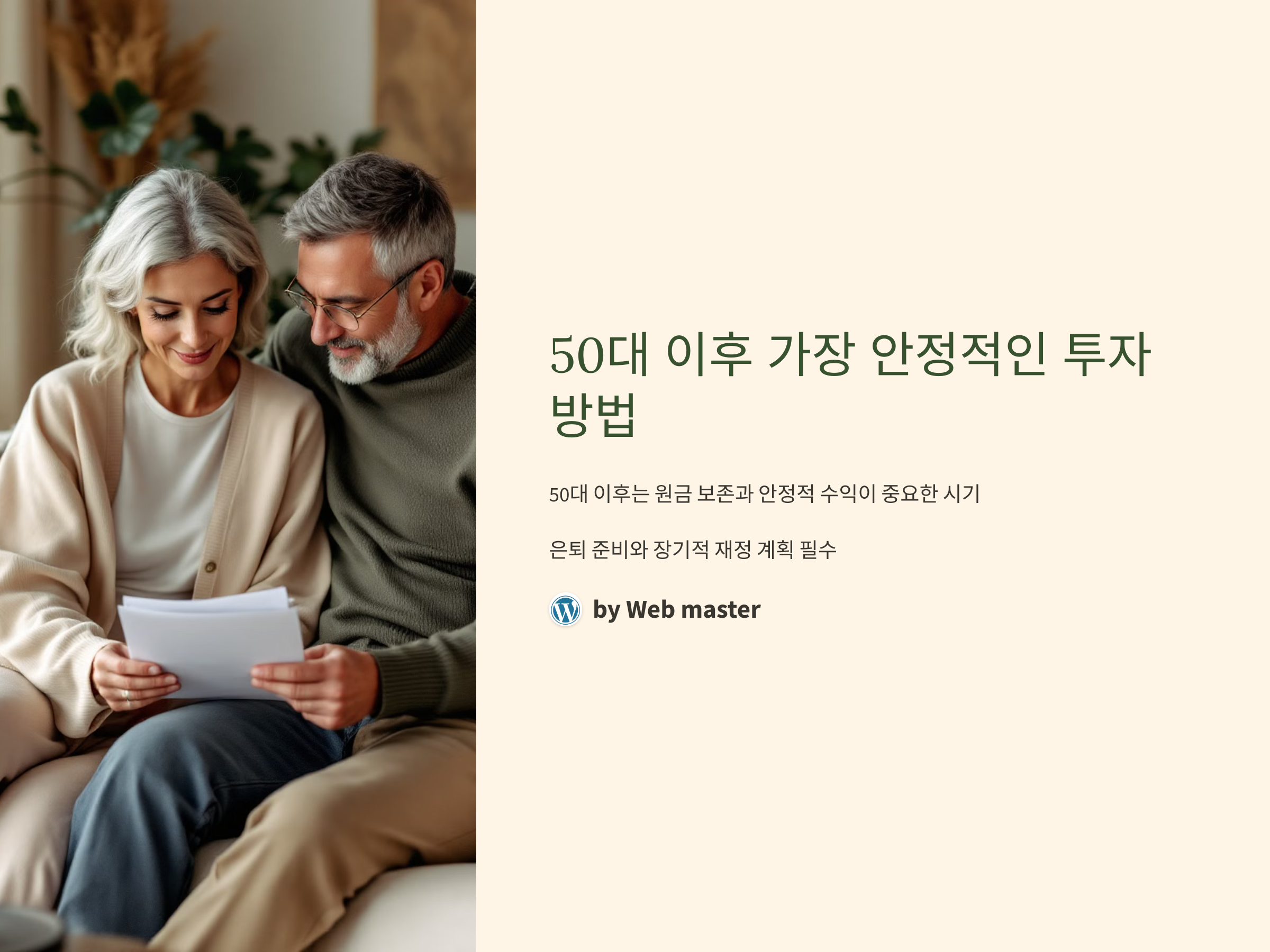 50대 이후, 안정적인 투자 방법을 찾는 것은 중요한 경제적 선택입니다. 이 시기에는 고위험 고수익을 추구하기보다는 원금 보존과 안정적인 수익을 목표로 하는 투자가 적합합니다. 특히 은퇴를 고려하거나 이미 은퇴한 사람들은 장기적인 재정 계획을 세우고, 남은 여생을 위한 자산을 안정적으로 관리하는 것이 매우 중요합니다. 이번 글에서는 50대 이후에 고려할 수 있는 가장 안정적인 투자 방법들을 소개하고, 각각의 장점과 특징을 알아보겠습니다.