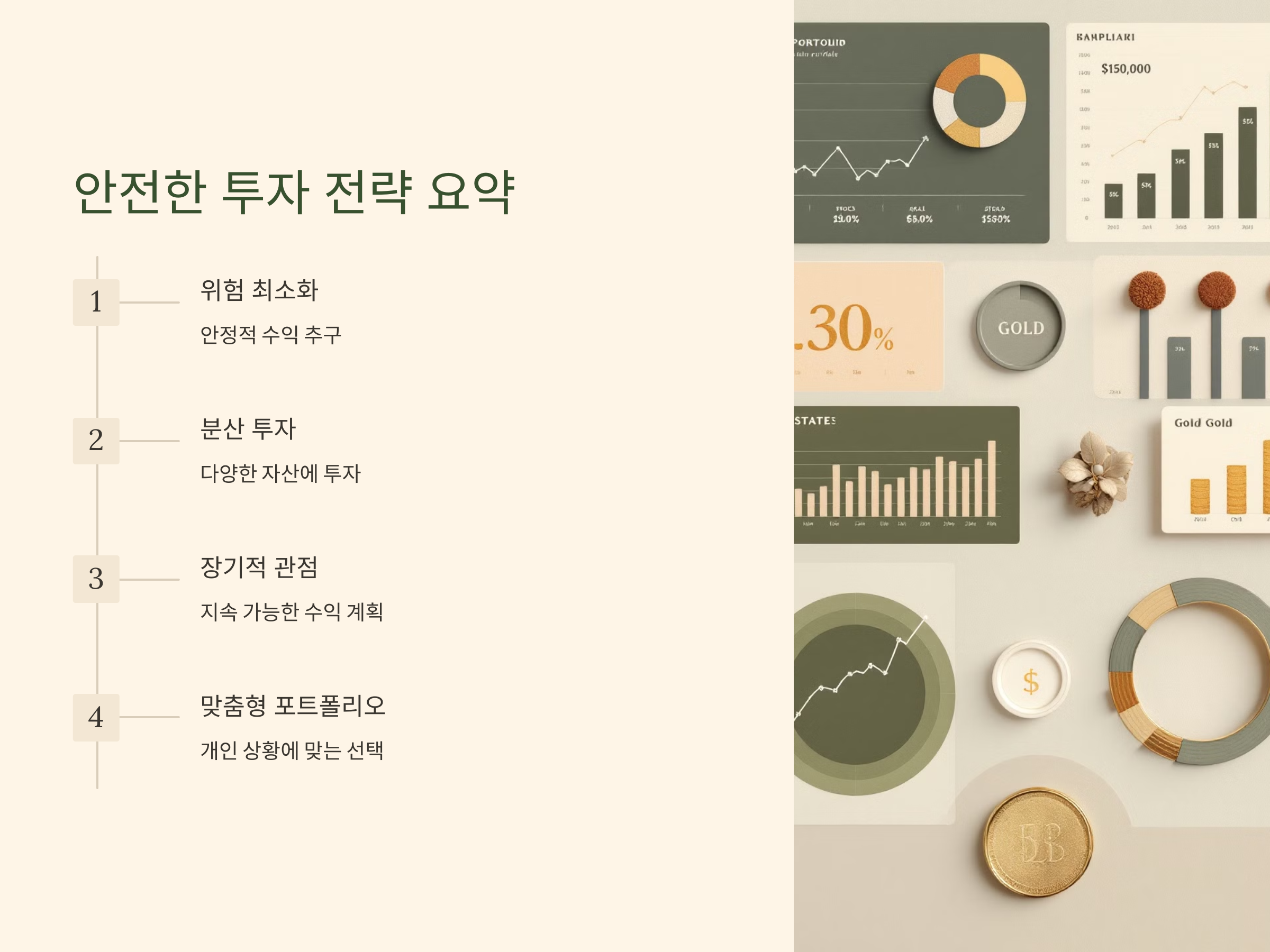 50대 이후의 안정적인 투자 방법은 다양하지만, 핵심은 위험을 최소화하고 안정적인 수익을 추구하는 것입니다. 대형주, 채권, 부동산, 금, 연금 상품 등 여러 가지 방법이 있으며, 각자의 상황에 맞게 선택할 수 있습니다. 중요한 것은 각 투자 방법의 장점과 단점을 이해하고, 분산 투자와 장기적인 관점에서 계획을 세우는 것입니다.