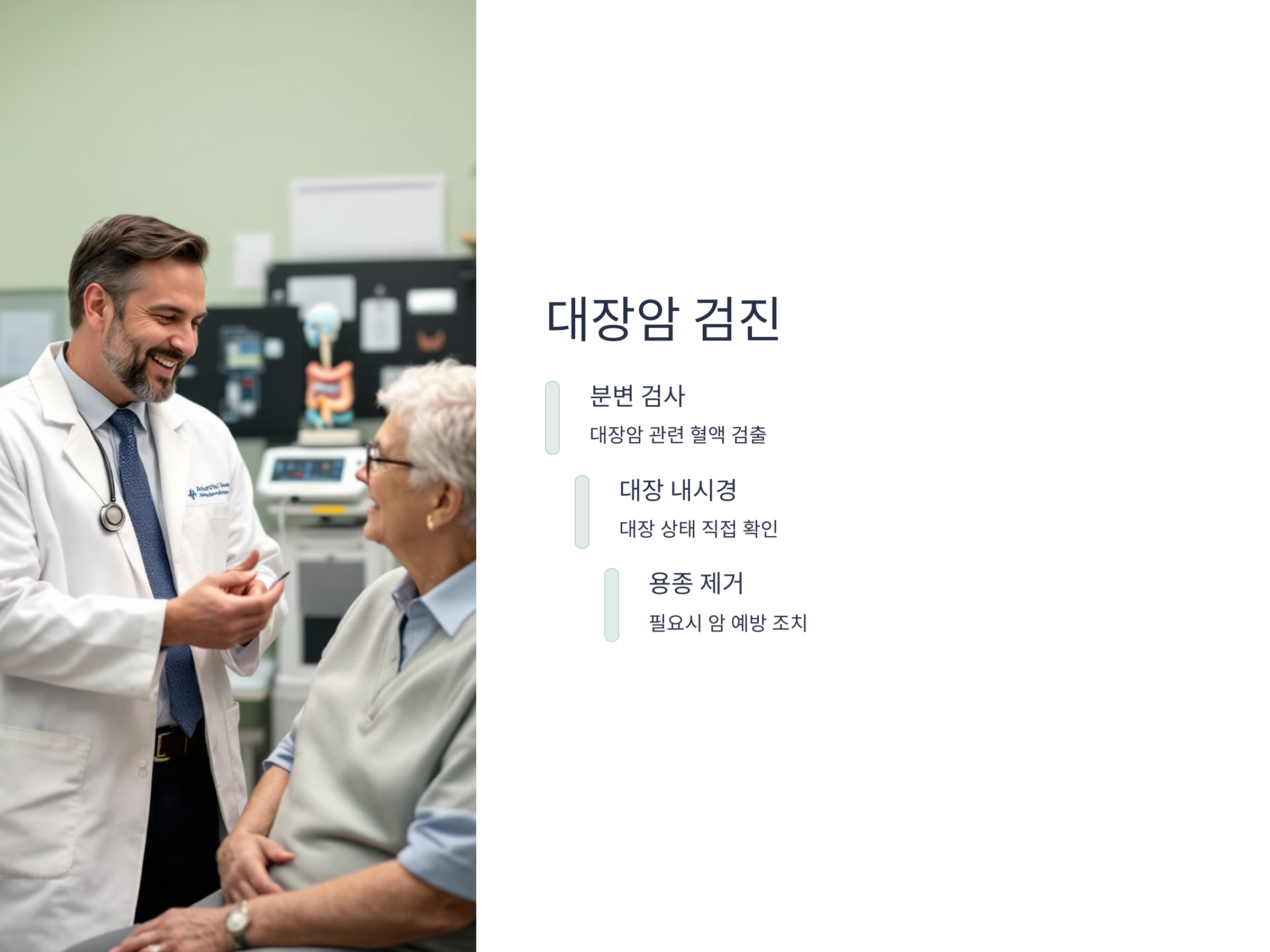 - 대장 내시경: 대장암을 조기에 발견할 수 있는 가장 중요한 방법으로, 50대 이후에는 1년에 한 번 정도 검사를 받는 것이 좋습니다.