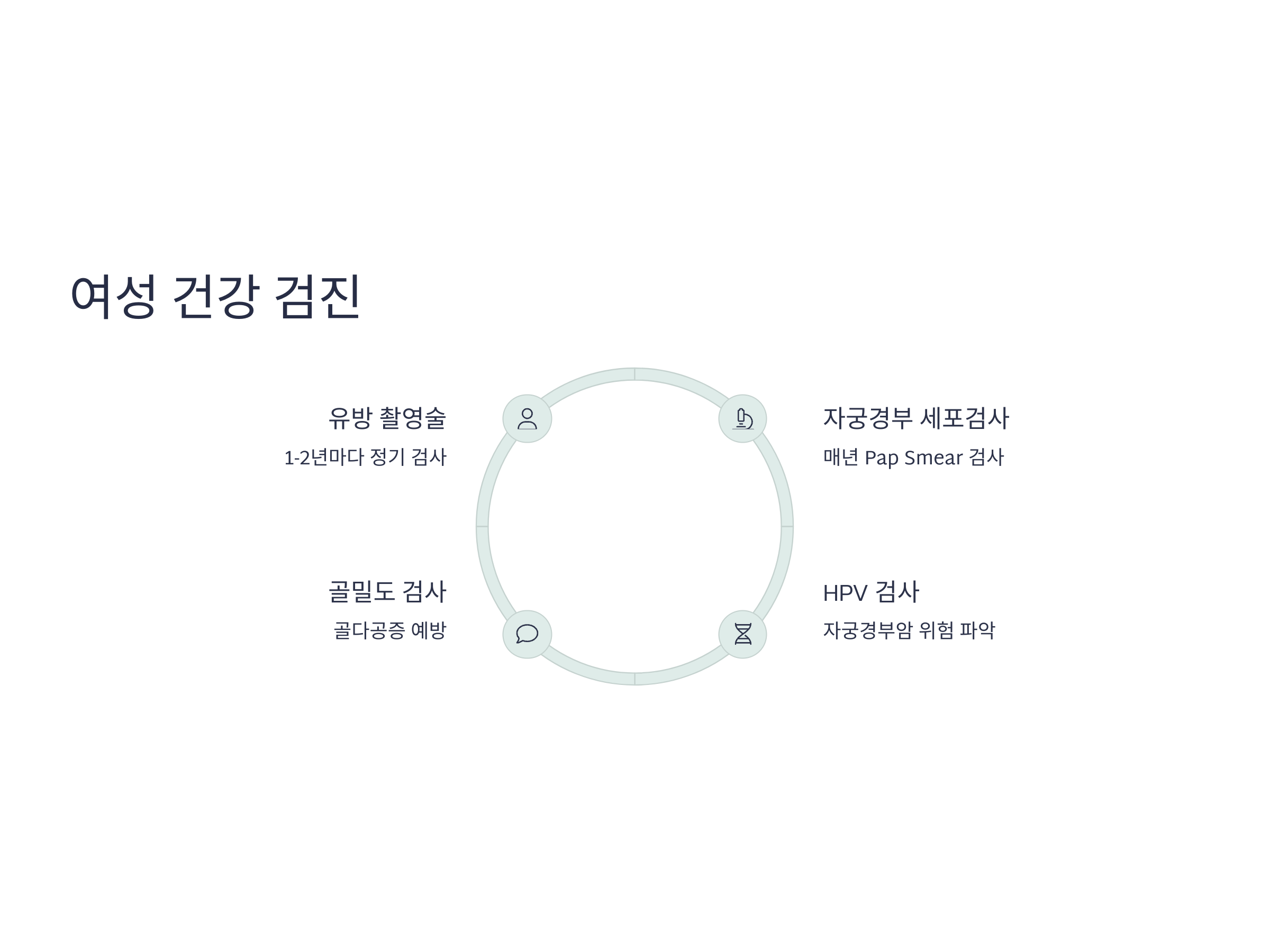 - 자궁경부암 검진: 자궁경부암의 초기 증상은 거의 없기 때문에, 매년 Pap Smear(자궁경부 세포 검사)와 HPV 검사를 하는 것이 필요합니다.