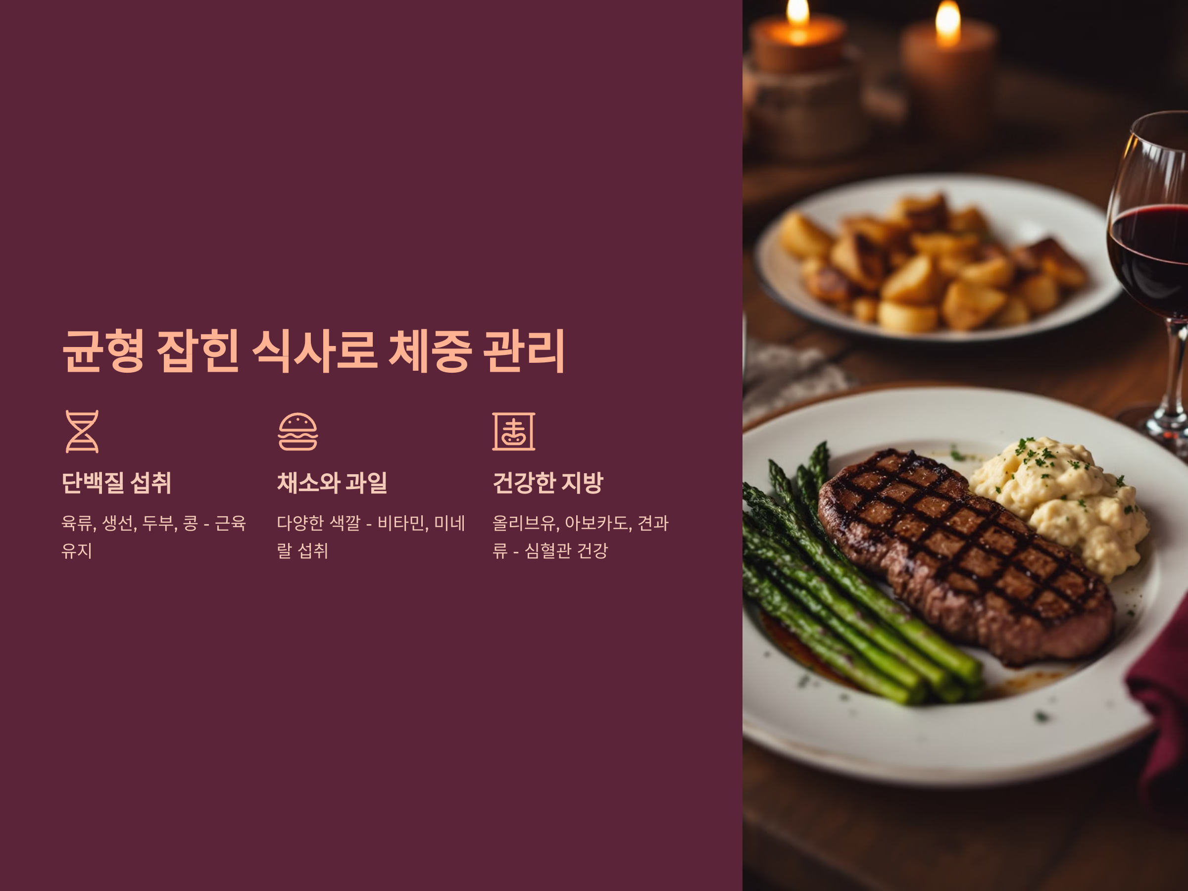 건강을 유지하기 위해서는 무엇보다도 올바른 식습관이 중요합니다. 50대 이후에는 대사율이 떨어지기 때문에 체중 관리가 더욱 중요한데요. 식사에서 필요한 영양소를 고르게 섭취하는 것이 핵심입니다.