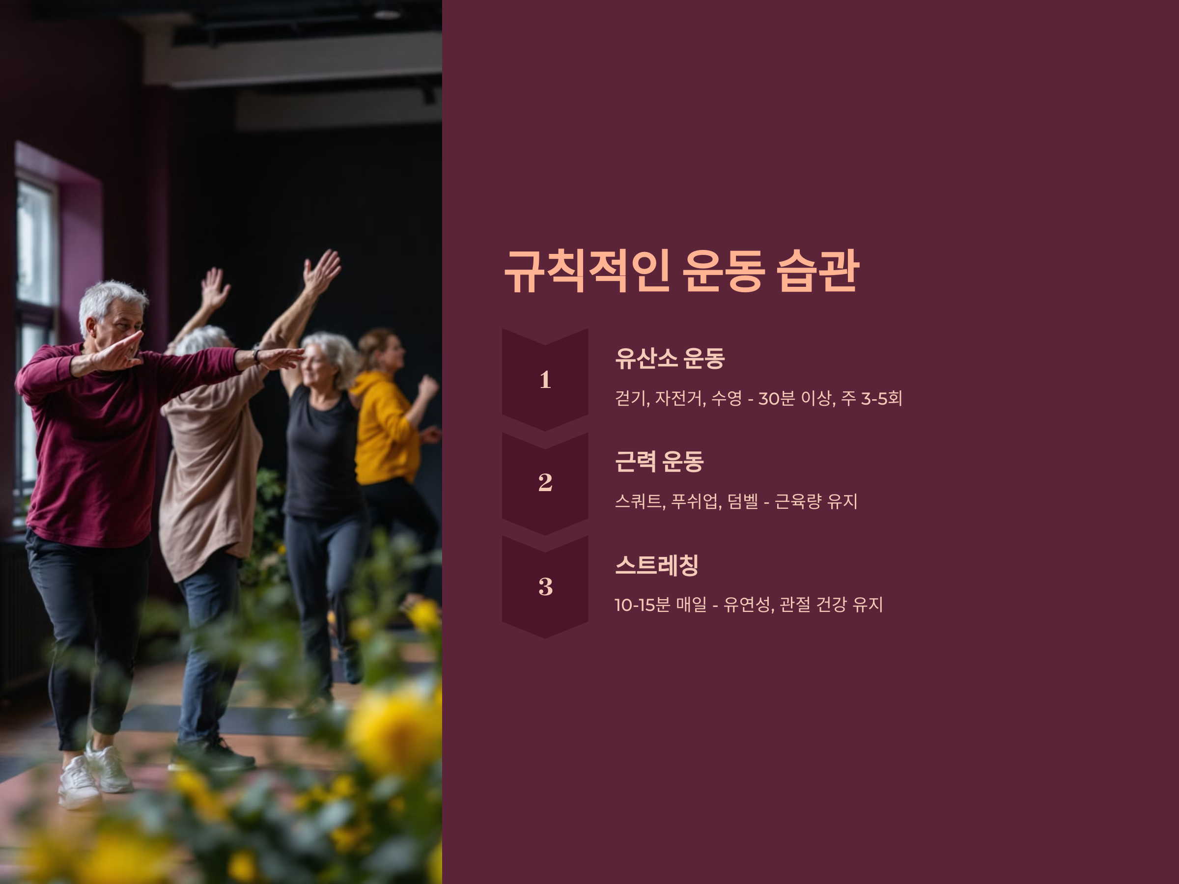 50대 이후에는 운동이 더욱 중요해집니다. 운동은 근육량 감소를 방지하고, 심혈관 건강을 유지하며, 정신 건강에도 긍정적인 영향을 미칩니다. 가장 중요한 것은 과도한 운동보다는 꾸준한 운동이 핵심입니다.