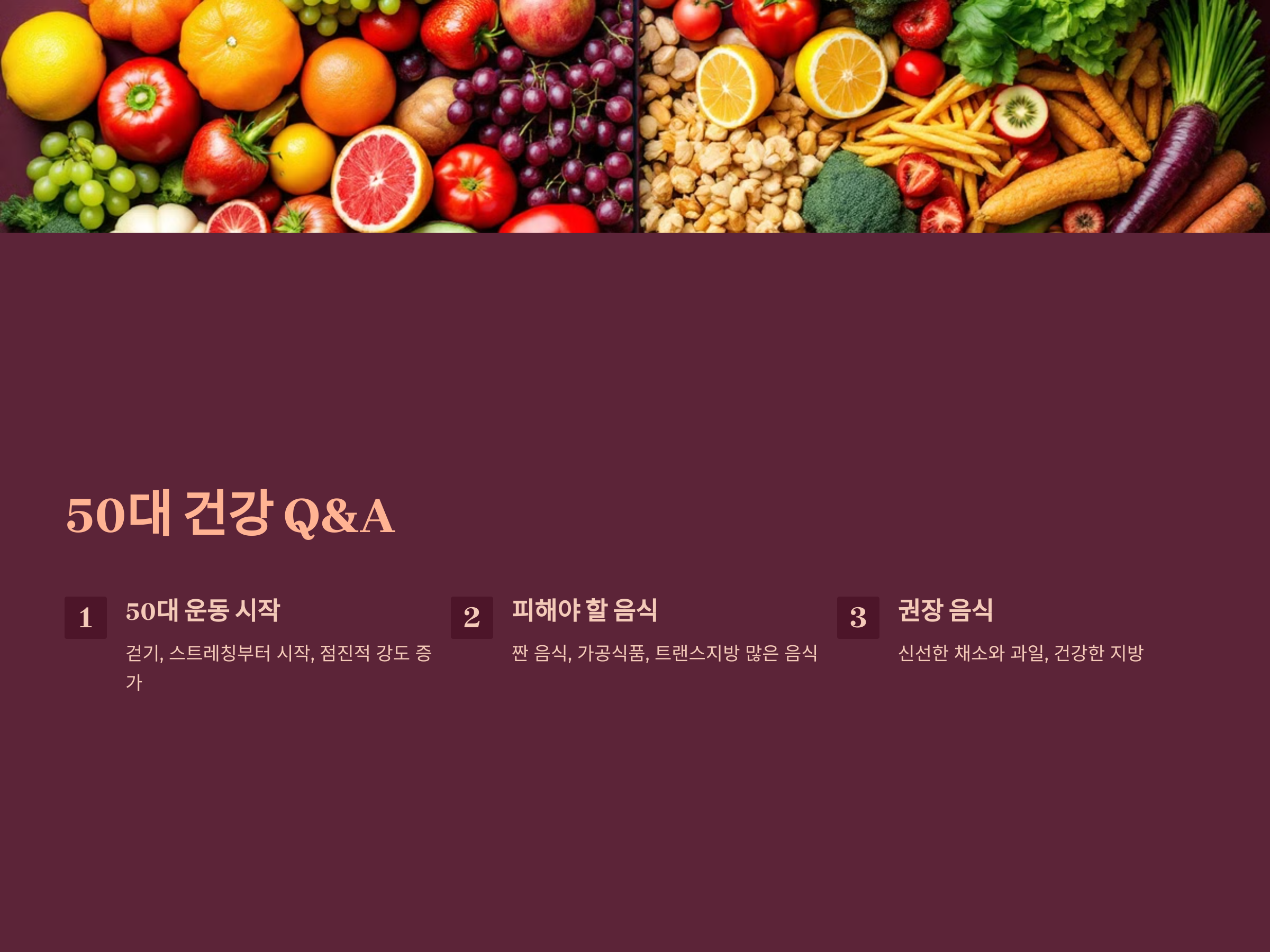 50대 이후에는 짠 음식, 가공식품, 트랜스지방이 많은 음식은 피하는 것이 좋습니다. 대신 신선한 채소와 과일을 충분히 섭취하고, 건강한 지방을 선택하세요.