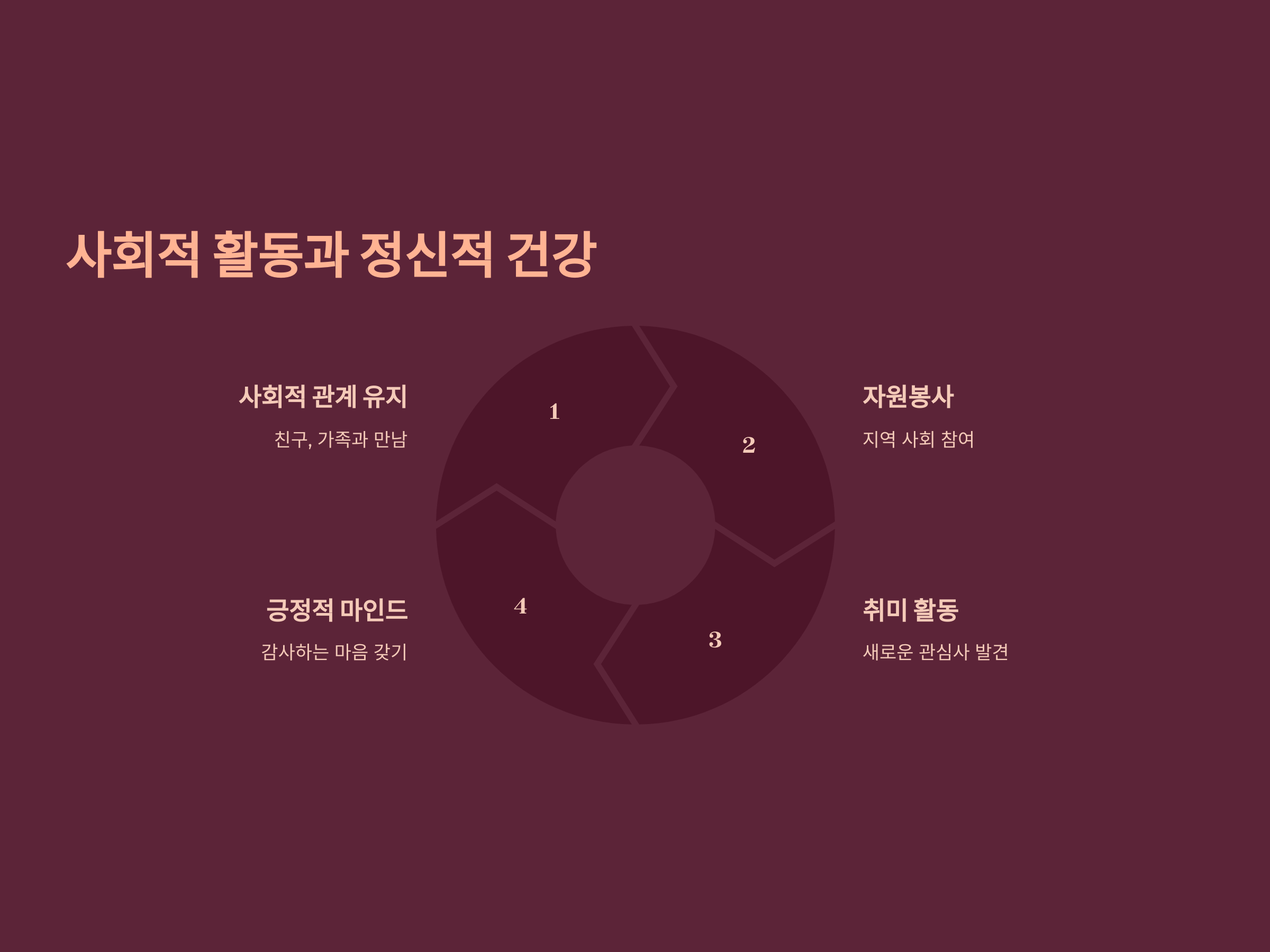 정신적 건강도 신체 건강만큼 중요합니다. 사회적 활동에 참여하고, 친구나 가족과 시간을 보내며 정신적인 건강을 유지하는 것이 필수적입니다.