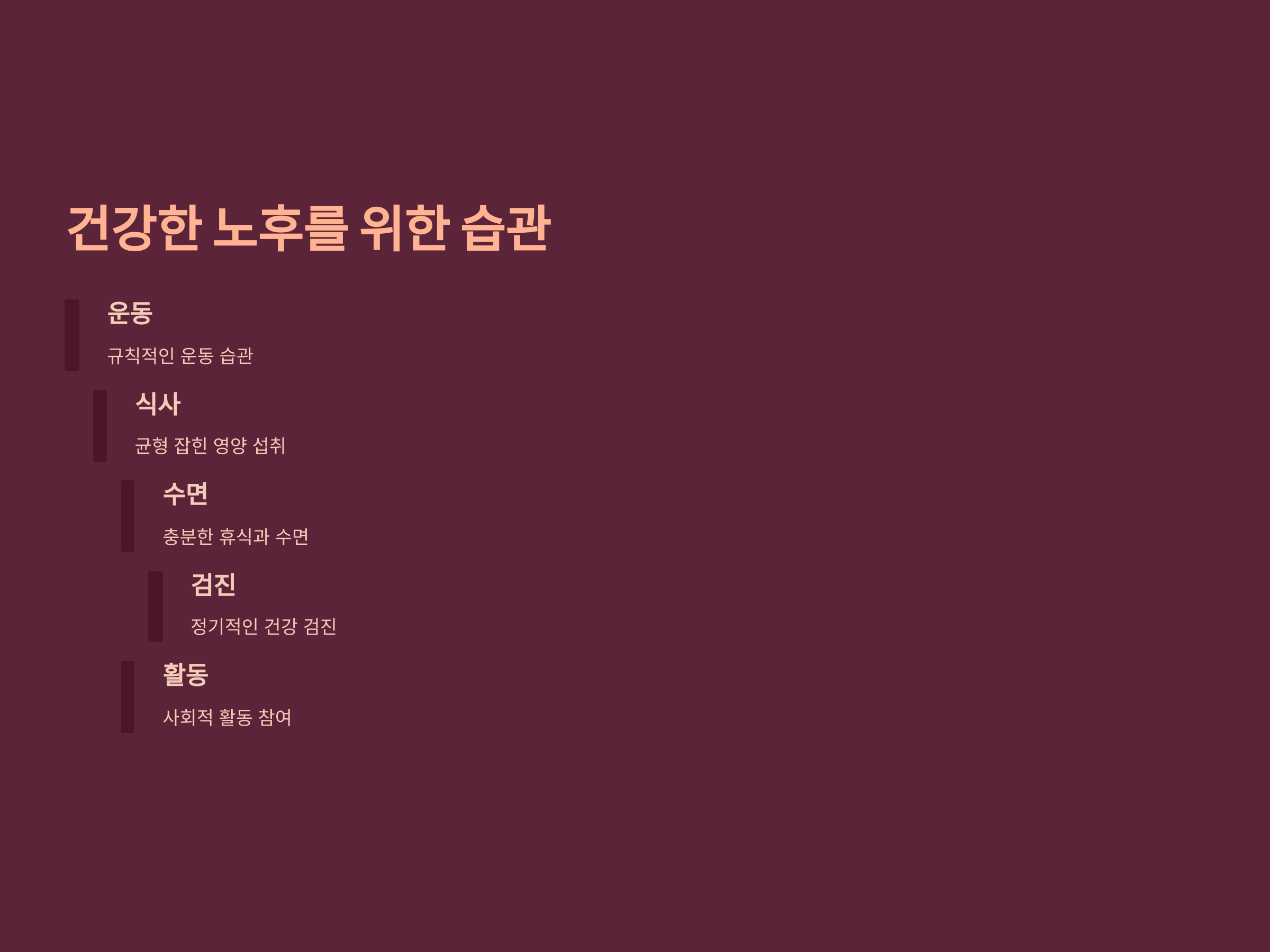 50대 이후 건강을 유지하려면 적절한 운동, 균형 잡힌 식사, 충분한 수면, 정기적인 검진, 그리고 사회적 활동이 필수적입니다. 이 습관들을 꾸준히 실천하면서 건강한 노후를 즐기세요. 오늘부터 조금씩 실천해보세요. 건강한 삶이 기다리고 있을 것입니다!