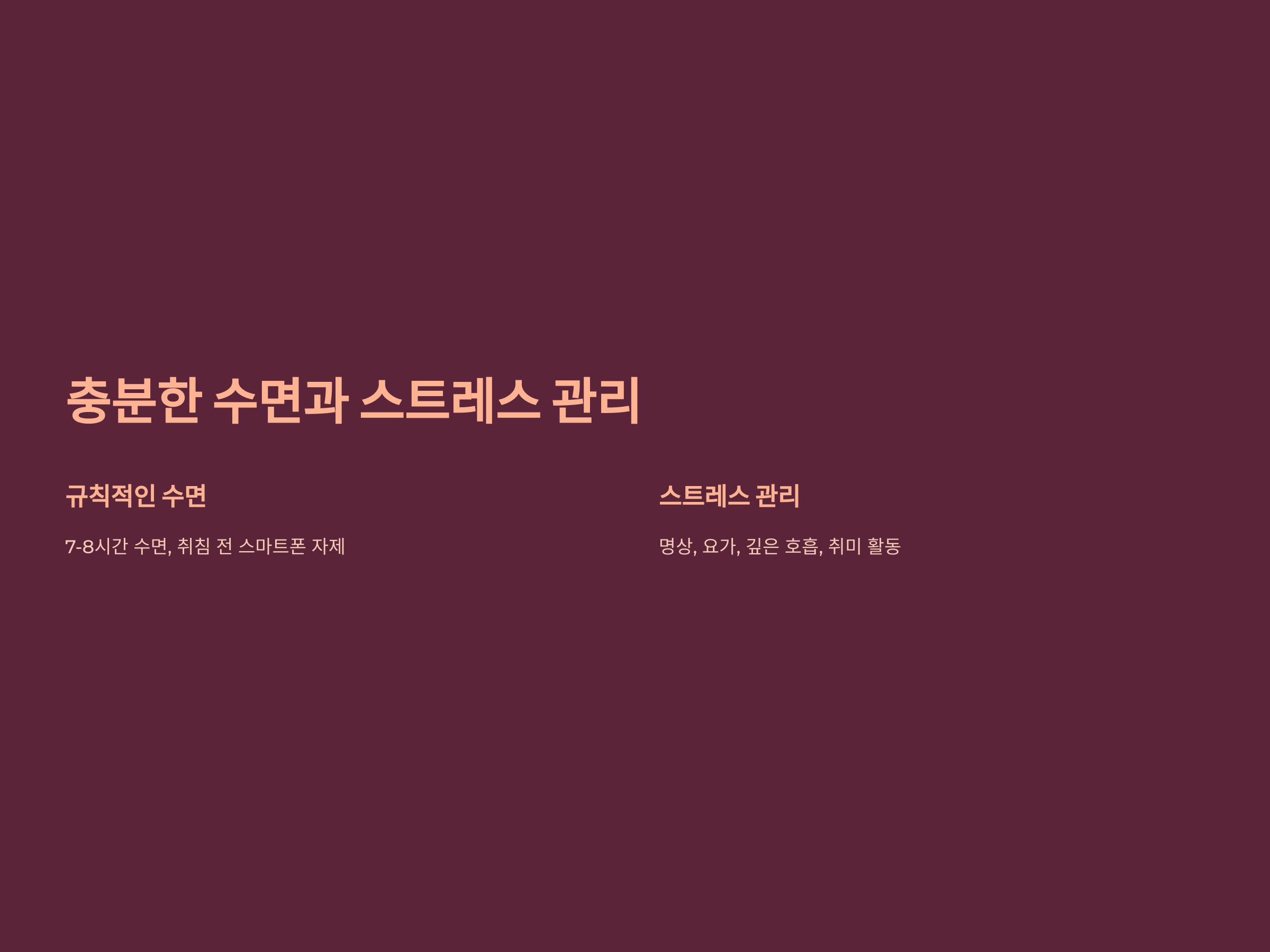 하루에 7~8시간 정도 충분한 수면을 취하는 것이 중요합니다. 규칙적인 수면 패턴을 유지하고, 잠자리에 들기 전에는 스마트폰 사용을 자제하는 등 수면의 질을 높이는 방법들을 실천해야 합니다. 수면은 신체 회복과 뇌의 기능을 향상시키는 데 필수적입니다.