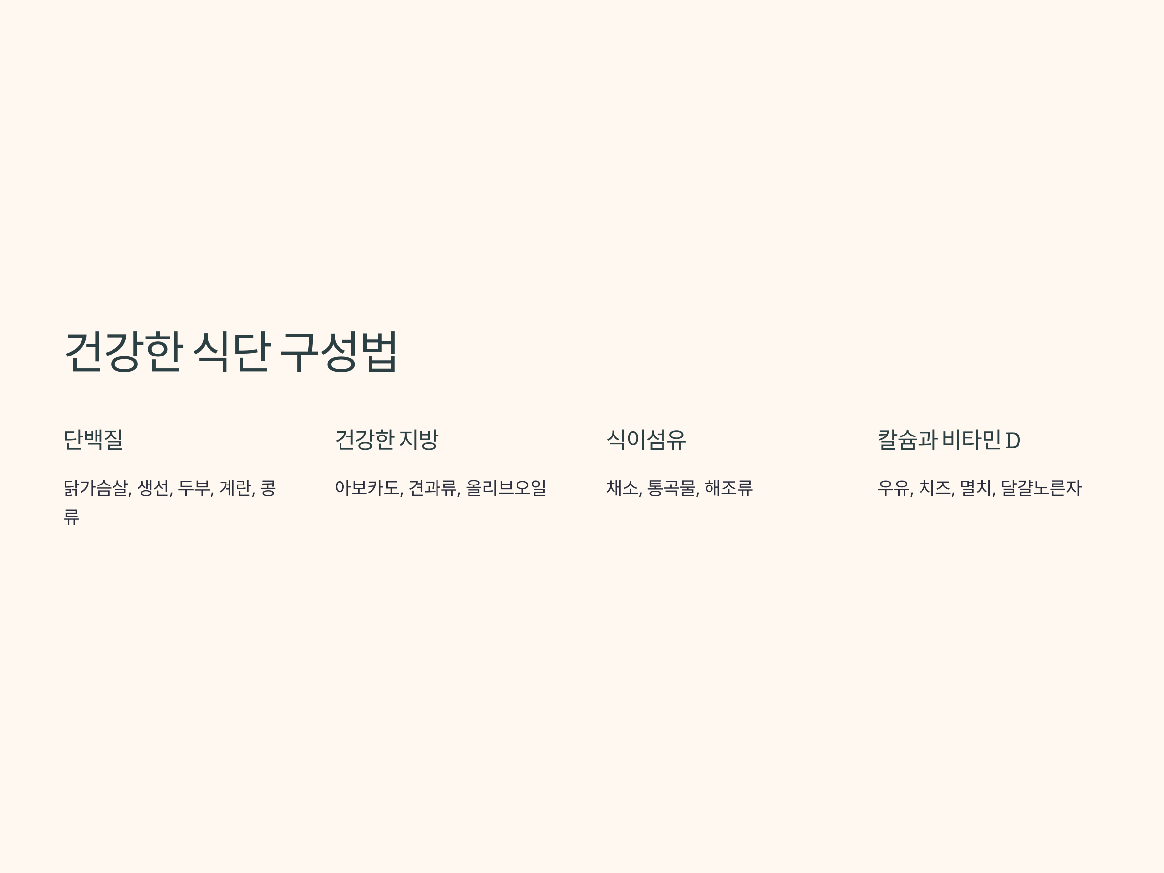 - 칼슘과 비타민 D: 우유, 치즈, 멸치, 달걀노른자, 버섯